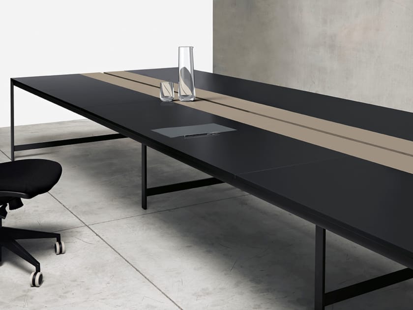K-Word is a desk facing with and without accent band, and for linear aggregation. The worktop is made of poplar wood panels covered in various finishes. The desk tops can also be customized thanks to accent bands available in various colors, width cm. 20, and having the same technical characteristics as the worktops. The pair of supporting bars under the table are made of tubular steel connected at the ends to two trestle legs with low stiffening crossbar made of tubular steel. The entire metal structure is powder coated.