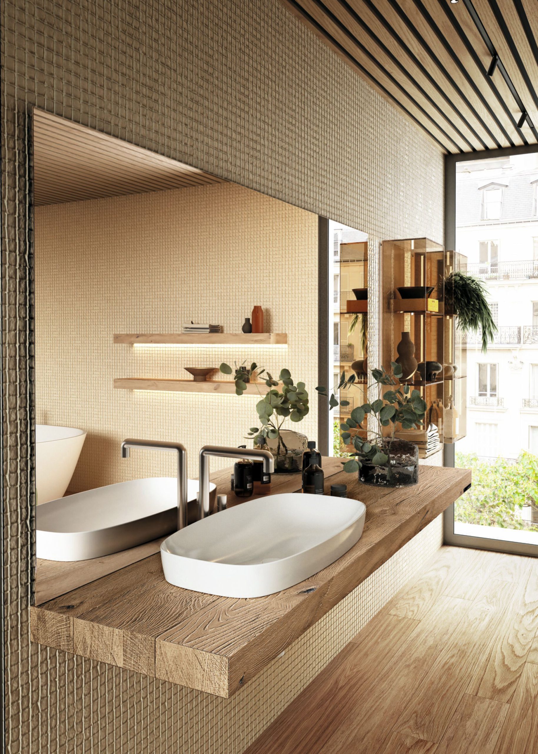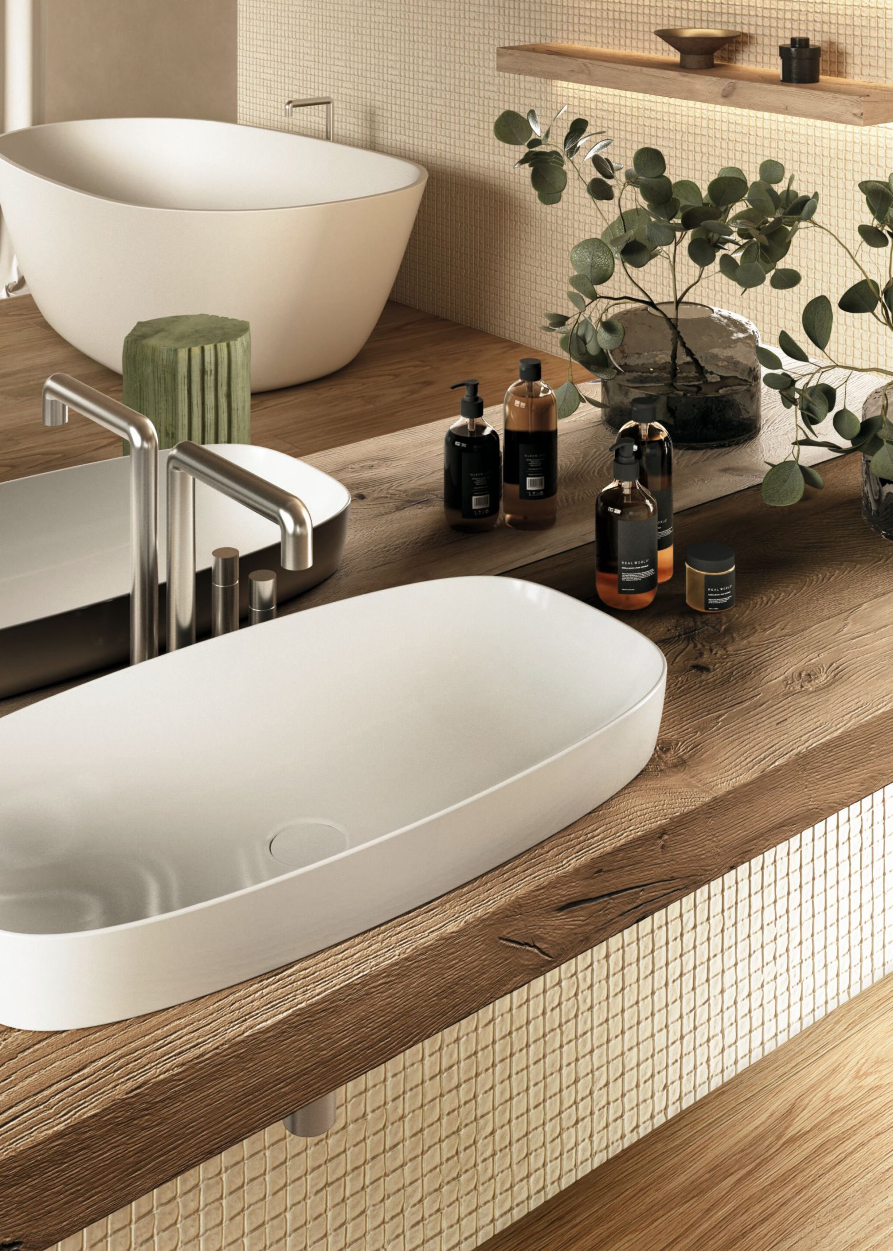 The ceramic Kera washbasin is innovative and ultra-practical, thanks to its rounded shape and matt enamelled finish. It can be used in different contexts and adapts to both shelves and base units, for more storage space. It adapts perfectly to any space, creating an elegantly well-thought-out bathroom space.