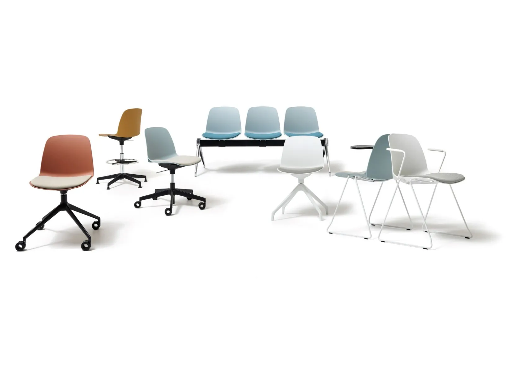 Polypropylene chair with clean design and innovative personalised detail in the backrest. The polypropylene shell is available in 6 different colours; it can be completely upholstered; or have a seat-cushion only. The range includes the fixed stacking versions with white, black or chromed sled or four-legged frames. The sled version is available with armrests with black or white polyurethane tops, an armrest with writing tablet, and remains stackable. The 4-legged version with natural or black lacquered ashwood shell is also available with armrests. The pyramid version comes: on a black or white polypropylene base; on a black, white or polished aluminium base; optionally with castors. A black or white polypropylene 5-spur height-adjustable version is also available. There are three stool versions: five-spur task; swivel with height-adjustment; and 4 black or white legs available at a choice of seat heights. Beam units with 2 to 5 seats.