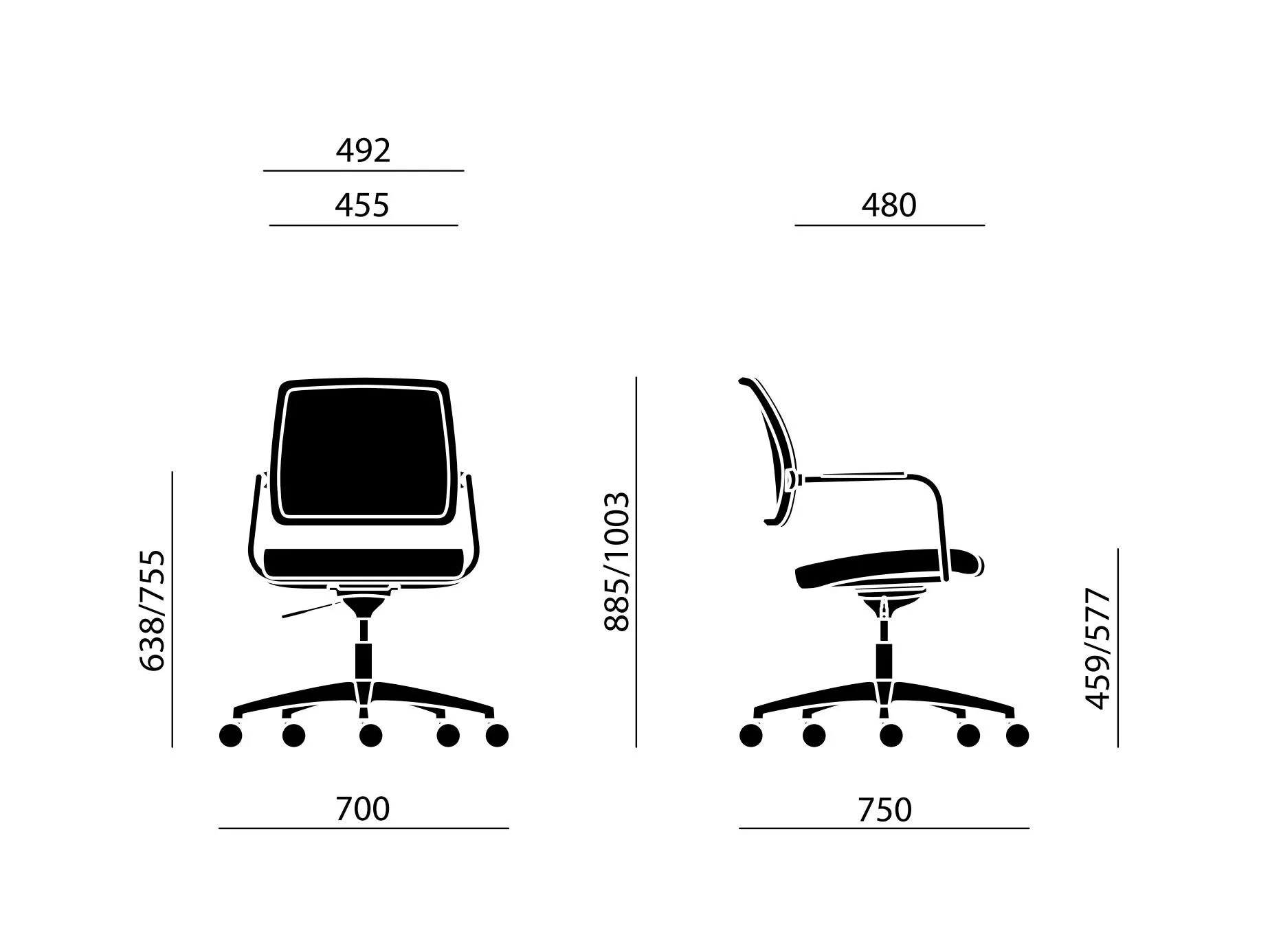 KOS AIR is a collection of guest and waiting chairs. It consists of a polyamide backrest and fire retardant self-supporting mesh, both in black. The seat is made of black polypropylene with an inner structure of multilayer wood. They are connected to each other by a tubular steel frame with a polypropylene pad that forms the armrest. The base is offered in four versions: cantilever, four-leg base, four-star pyramid base and five-star swivel base in die-cast aluminium with braked swivel castors. The steel tubulars are offered in a chromed or black painted finish with polypropylene feet.