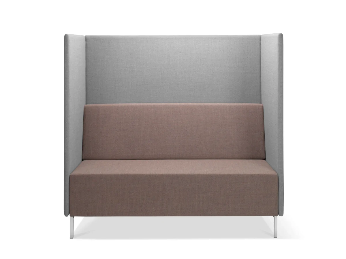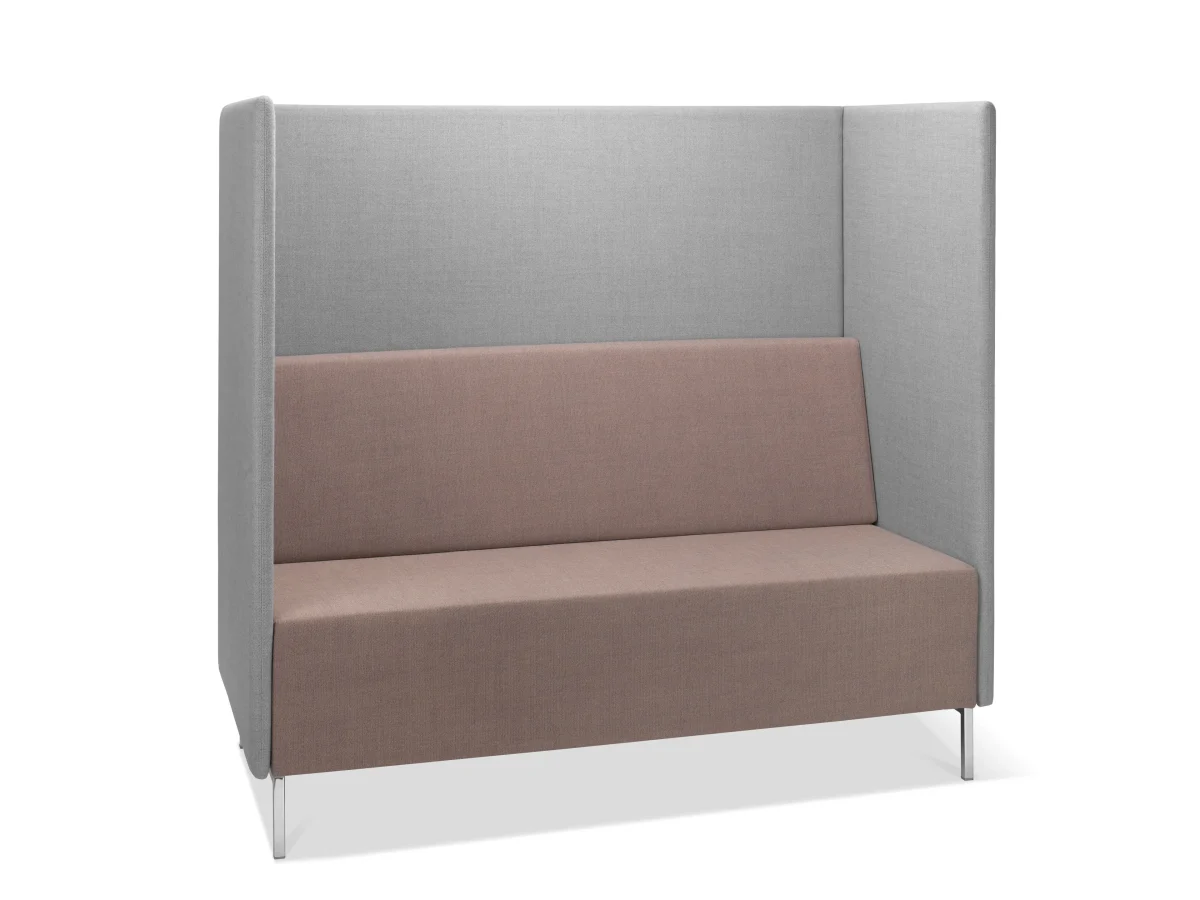 KUBIK BOX KB2 is a 2-seater booth with fully upholstered shell, it consists of a stool for sitting, a support pillow and an three-part upholstered wall (the individual parts of the booth can be upholstered in various upholstery fabrics), N1 black or N2 grey powder-coated 4-leg steel base, plastic gliders.