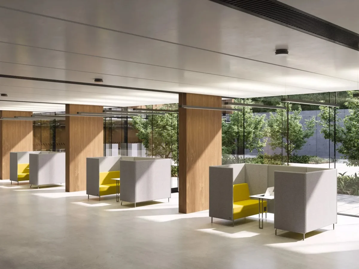The KUBIK BOX series consists of one- to three-seater boxes which can form closed assemblies using a connecting padded wall. They are the perfect privacy solution in large open space offices and public places. The boxes consist of a stool, a support pillow and an upholstered wall, each part can be upholstered in a different colour. An electrical plug can be added to the boxes and closed sets can be supplemented with a table. The design of all KUBIK BOX models matches the KUBIK series.
