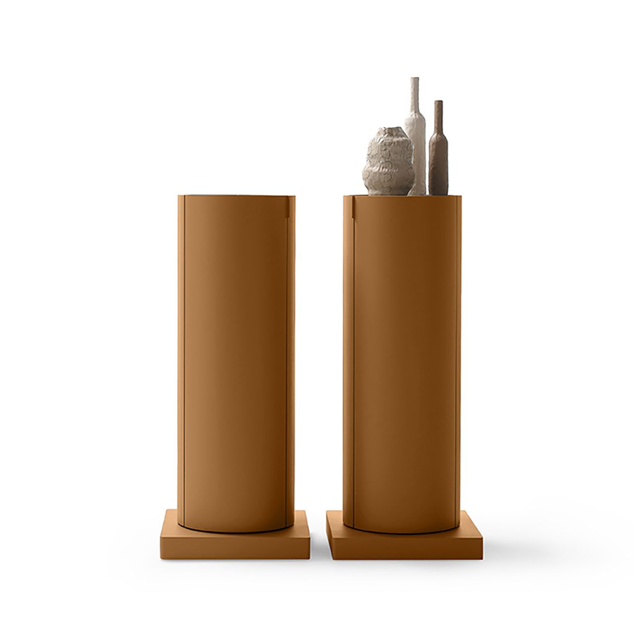 La Dori is a storage column made of curved plywood, complete with internal glass shelves. Available in textured lacquer or high-gloss direct lacquer (non-brushed). The base must be ordered together with the column. Two types of bases are available: a lacquered tambour base to match the column with adjustable feet, or a black painted metal plate base non-adjustable.