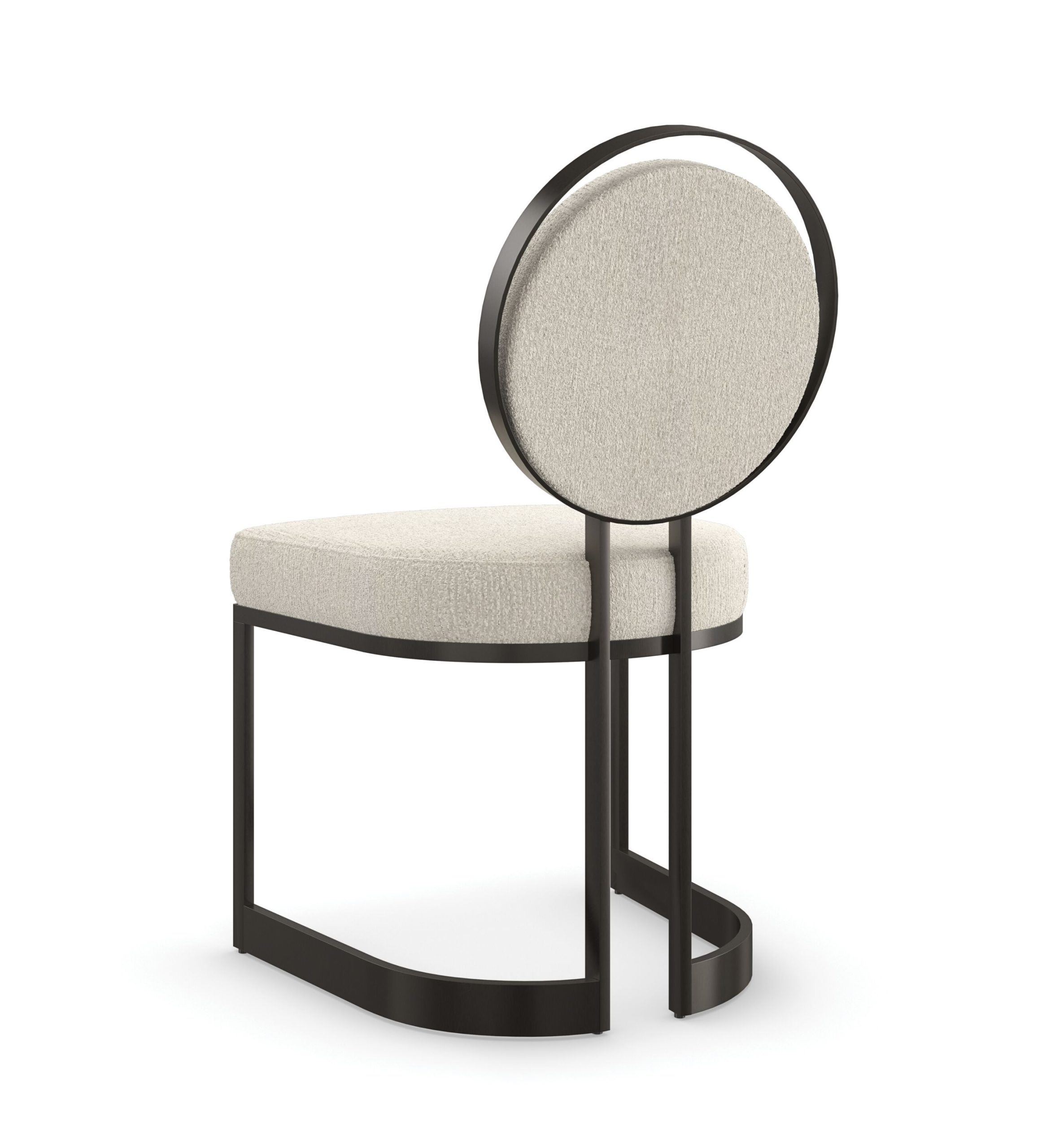 La Lune sculptural metal chair lends an artful element to dining interiors, with a seemingly floating upholstered back set inside a metal circle. A sliver of space around the edges evokes phases of the moon and mimics its crescent-shaped frame. A tactile ivory fabric is welcoming to the senses and in dramatic contrast to a rich, Chocolate Bronze finish.