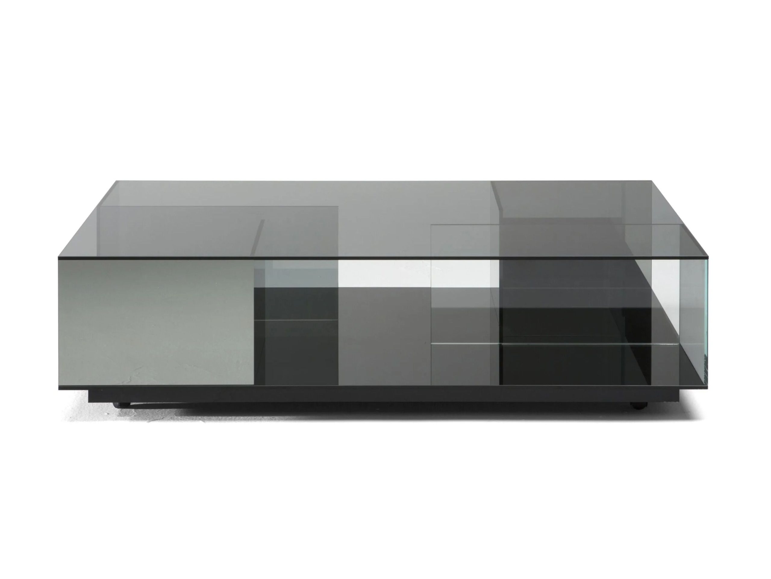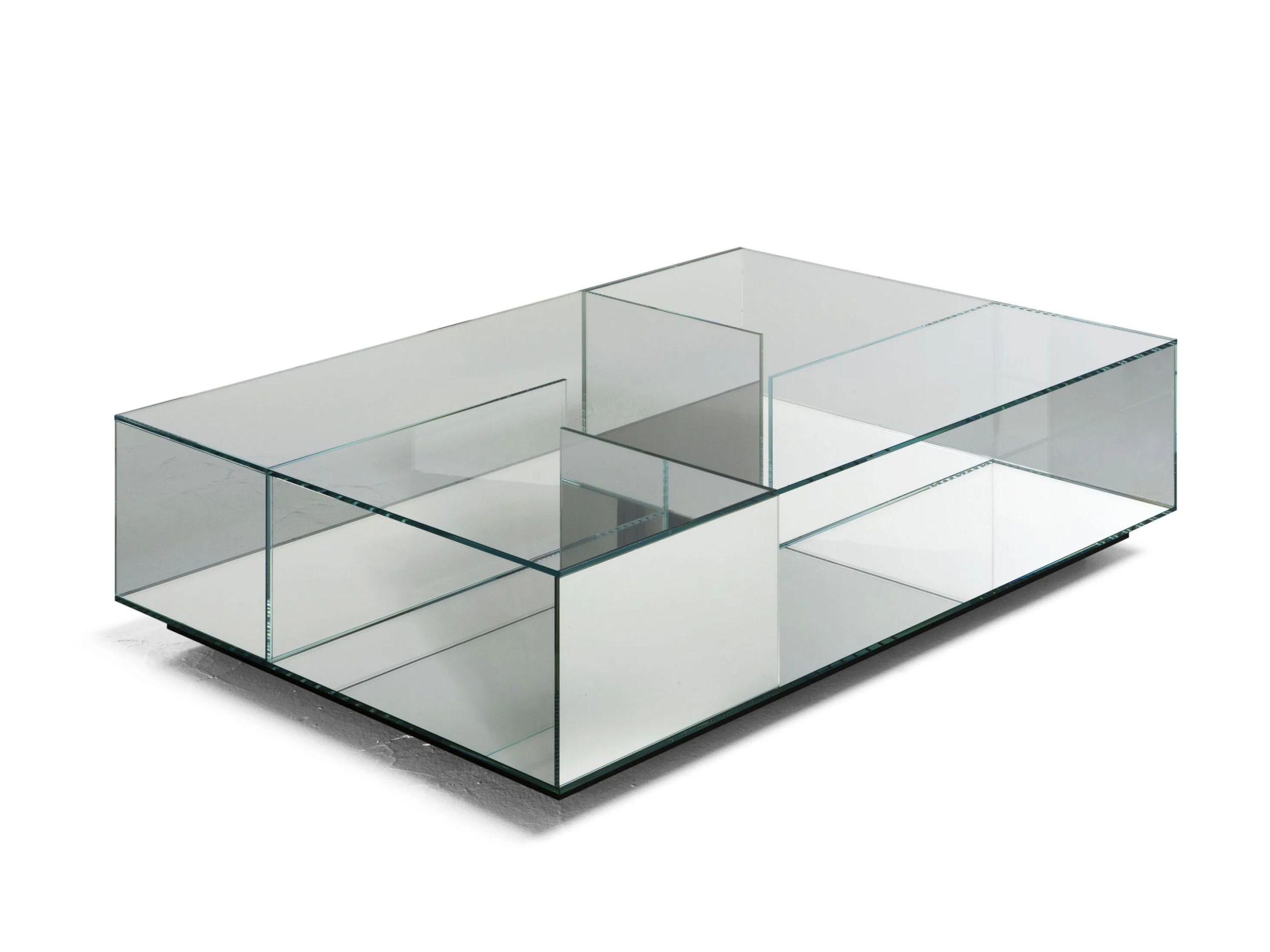 Glass in a variety of tones creates an intricate interplay of hues and geometric shapes. All the tempered glass combined with mirrored glass parts are attached to electrowelded steel elements by means of a UV gluing technique. Enraptured, the eye is lost in its beauty. The Labirinto coffee table has castors making them easy to move around while the double-top coffee table can be used as a bookcase.