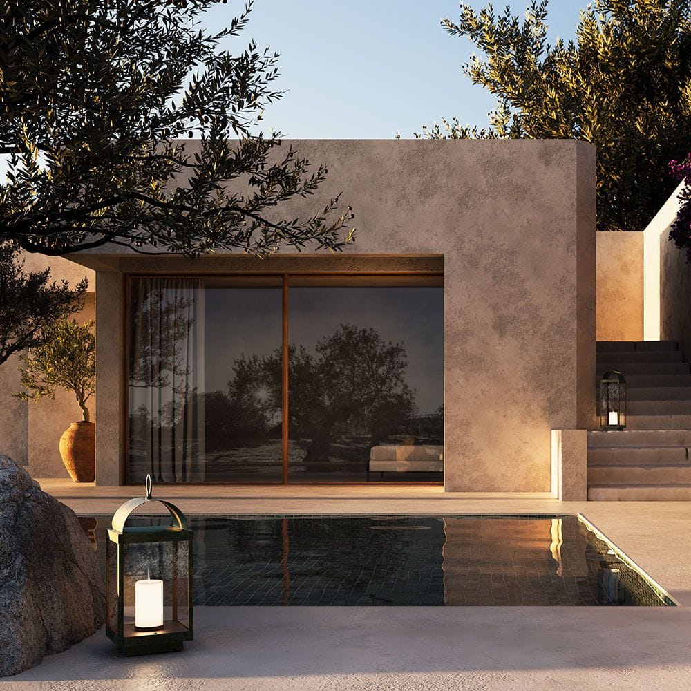 The Lanterne collection of outdoor lamps, inspired by the Orient, creates the same atmospheres as candlelight. Designed for those who love soft amber light, which becomes the absolute protagonist, it is available in different models with an Italian brass fixture and transparent glass.