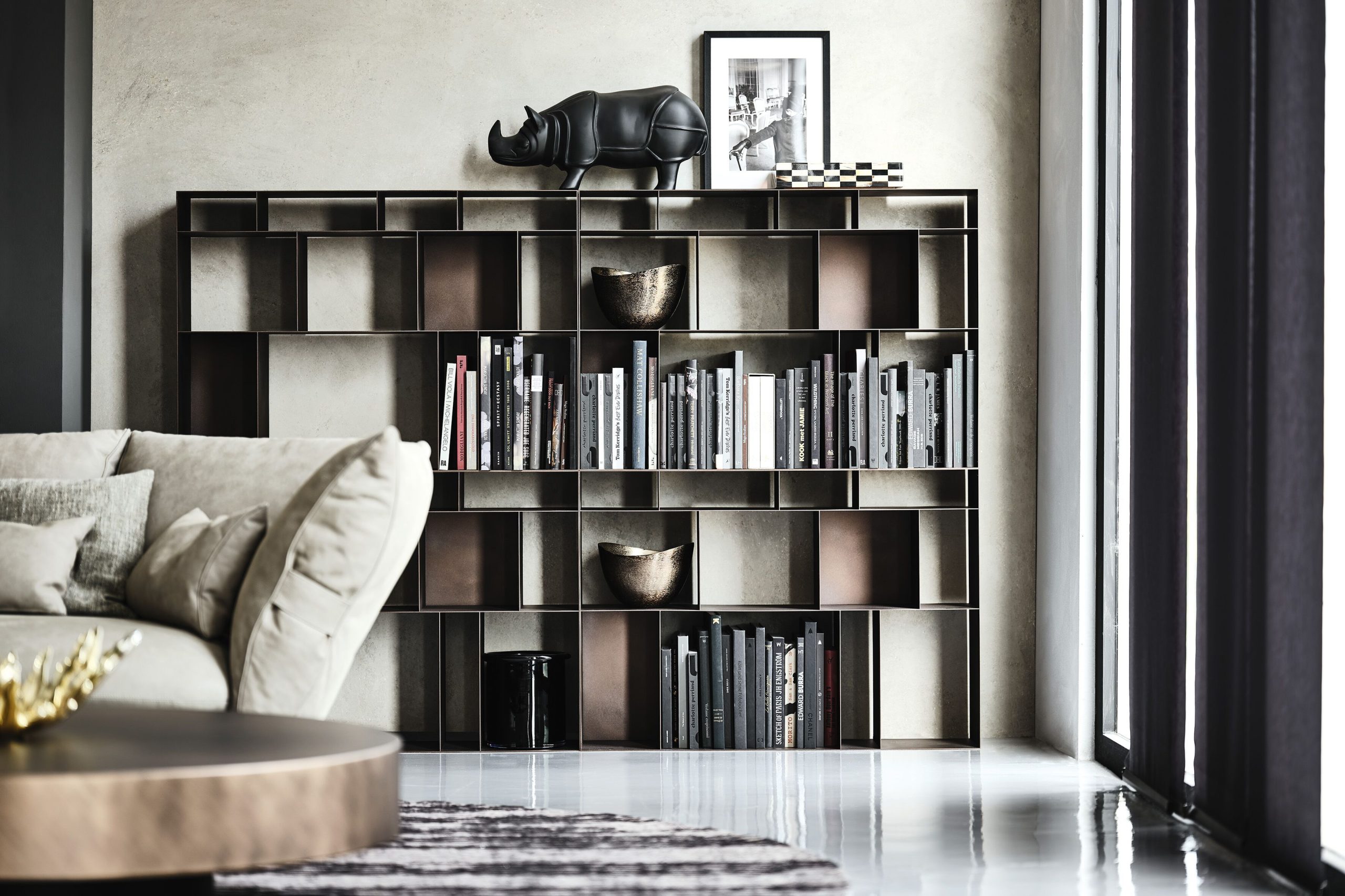 One bookcase, several options. The Latitude modular bookcase consists of a single repeatable module which forms many compositions, making the most out of a room’s space and walls. The Latitude bookcase succeeds in emphasizing the height of a column with a vertical composition. With a rectangular configuration it becomes a perfect room divider, a partition bookcase which allow you to see through. With a low horizontal composition it turns out to be an ideal service cabinet leaning against a wall or placed against the back of a sofa or the back of a bed, placed in the center of the room. The metallic finish gives brightness and value to this modern modular bookcase, which is adaptable to any style requirement.