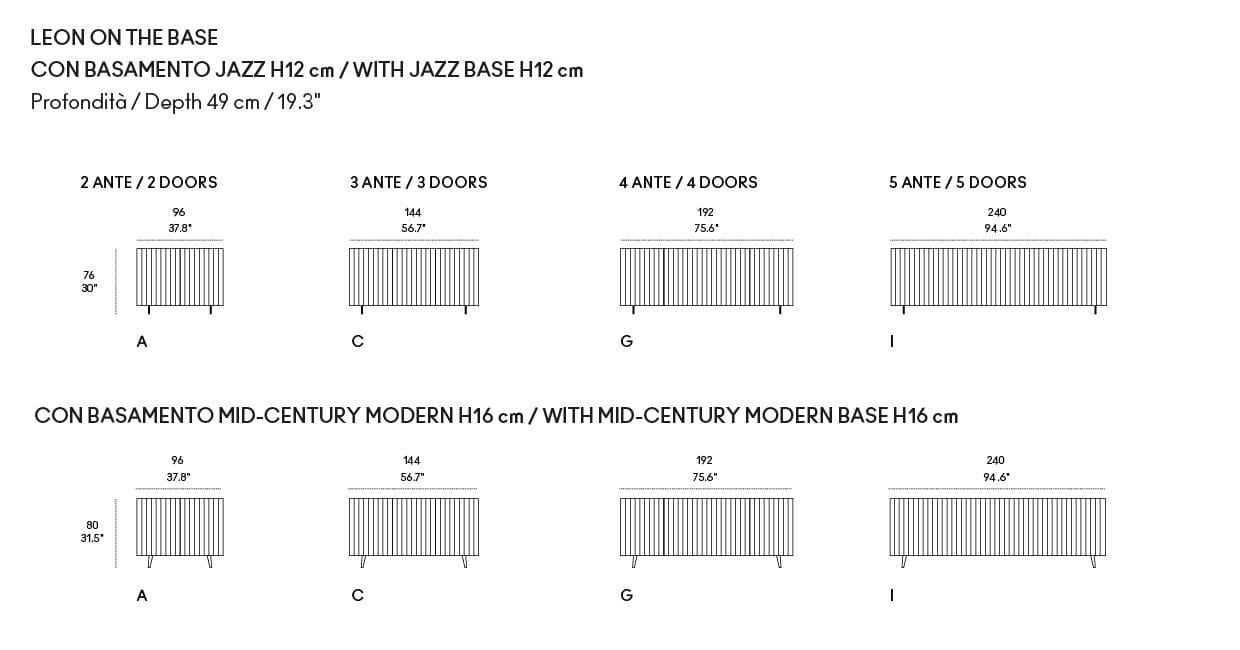 Leon plays with an awe-provoking optical effect that underlies its salient feature, that is, a standpoint-dependent visualization. From the front, the doors appear marked by vertical multi-coloured stripes yet, when observed from the side, dark or light uniformity prevails. Even the unique lacquered white finish produces the same effects through room lighting.