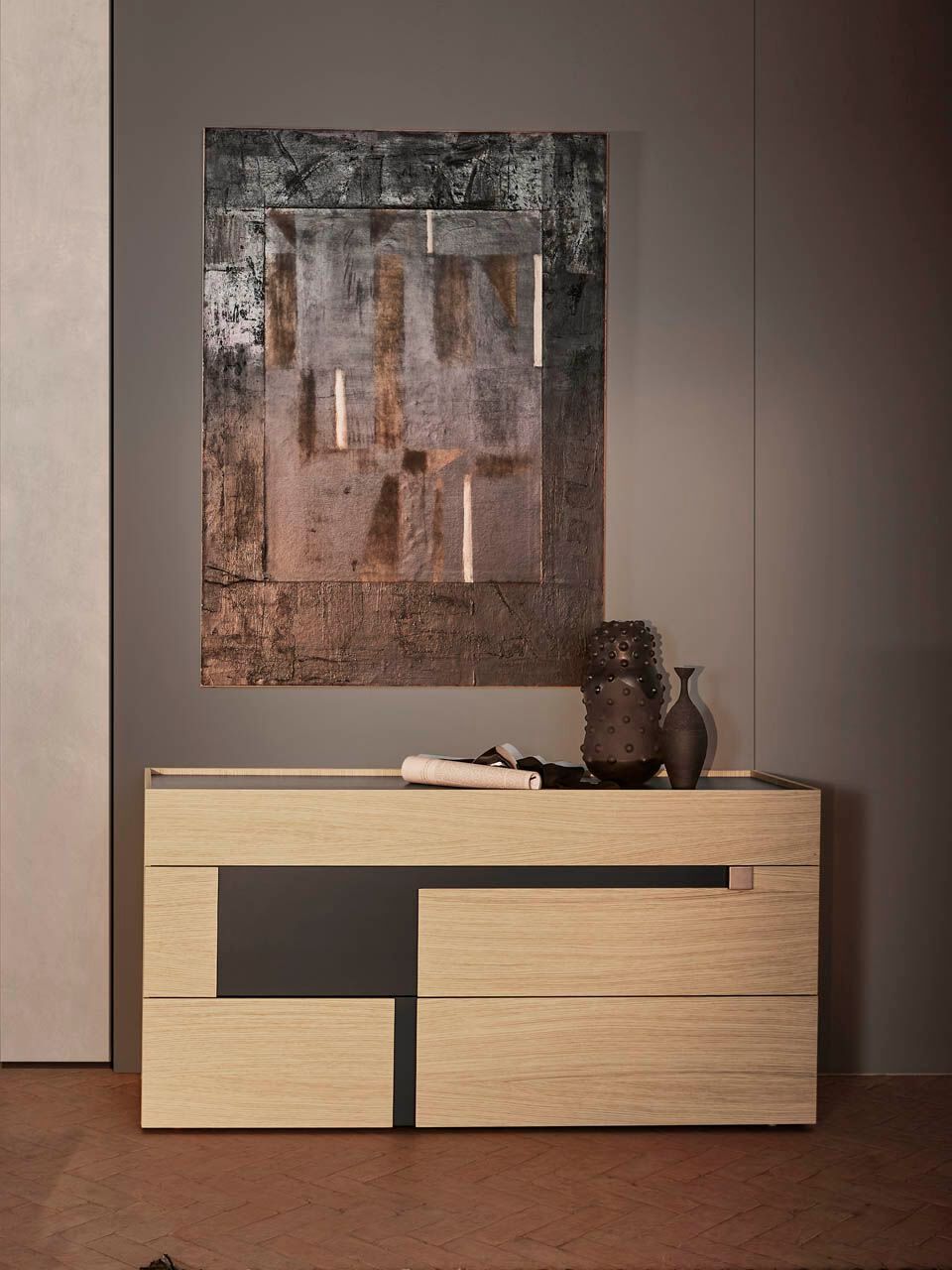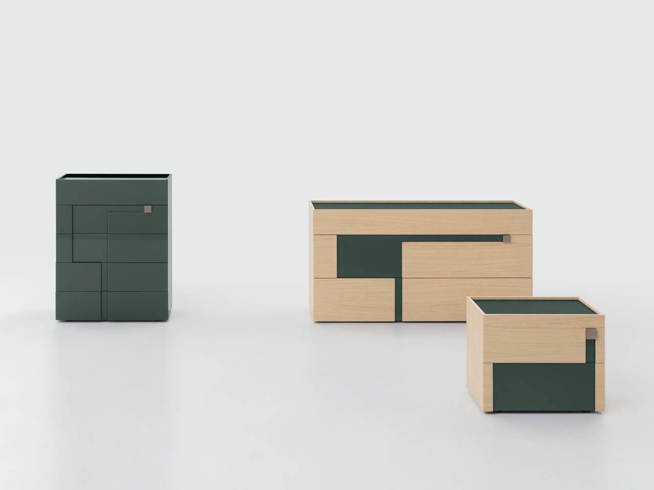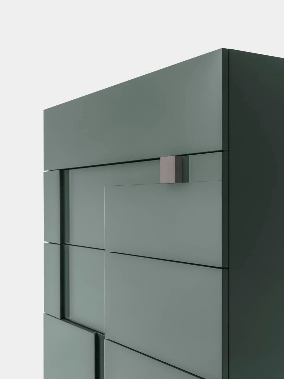 Geometry and elegance. Logos is a tribute to Bruno Munari and his studies on the effects of juxtaposing different colors. The front of the modules in this collection of casegoods is distinguished by the presence of offset, overlaid elements. Contrasting colours and volumes can be used on the outside and inserts of the structure, to create different, vibrant and dynamic looks. The unusual geometry of the surfaces also allows the drawer to open.