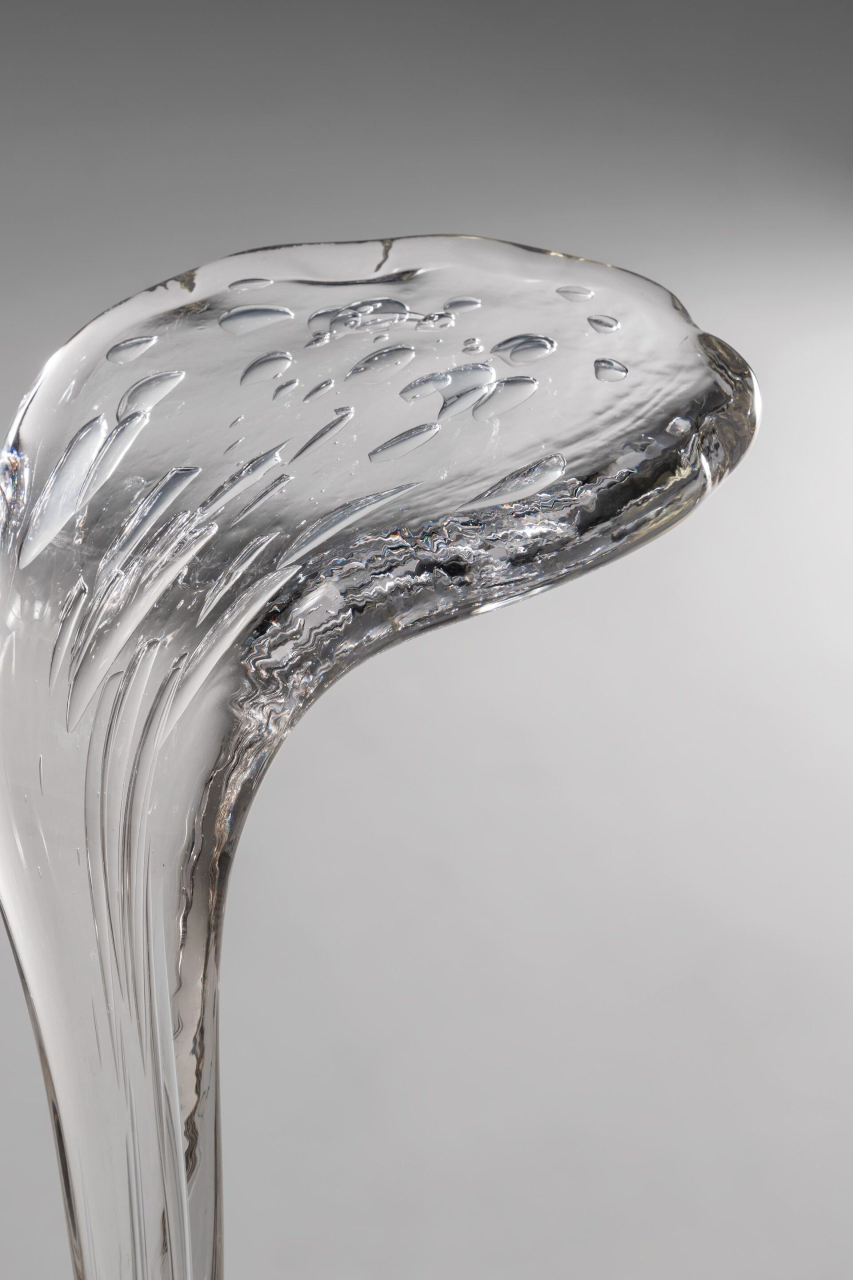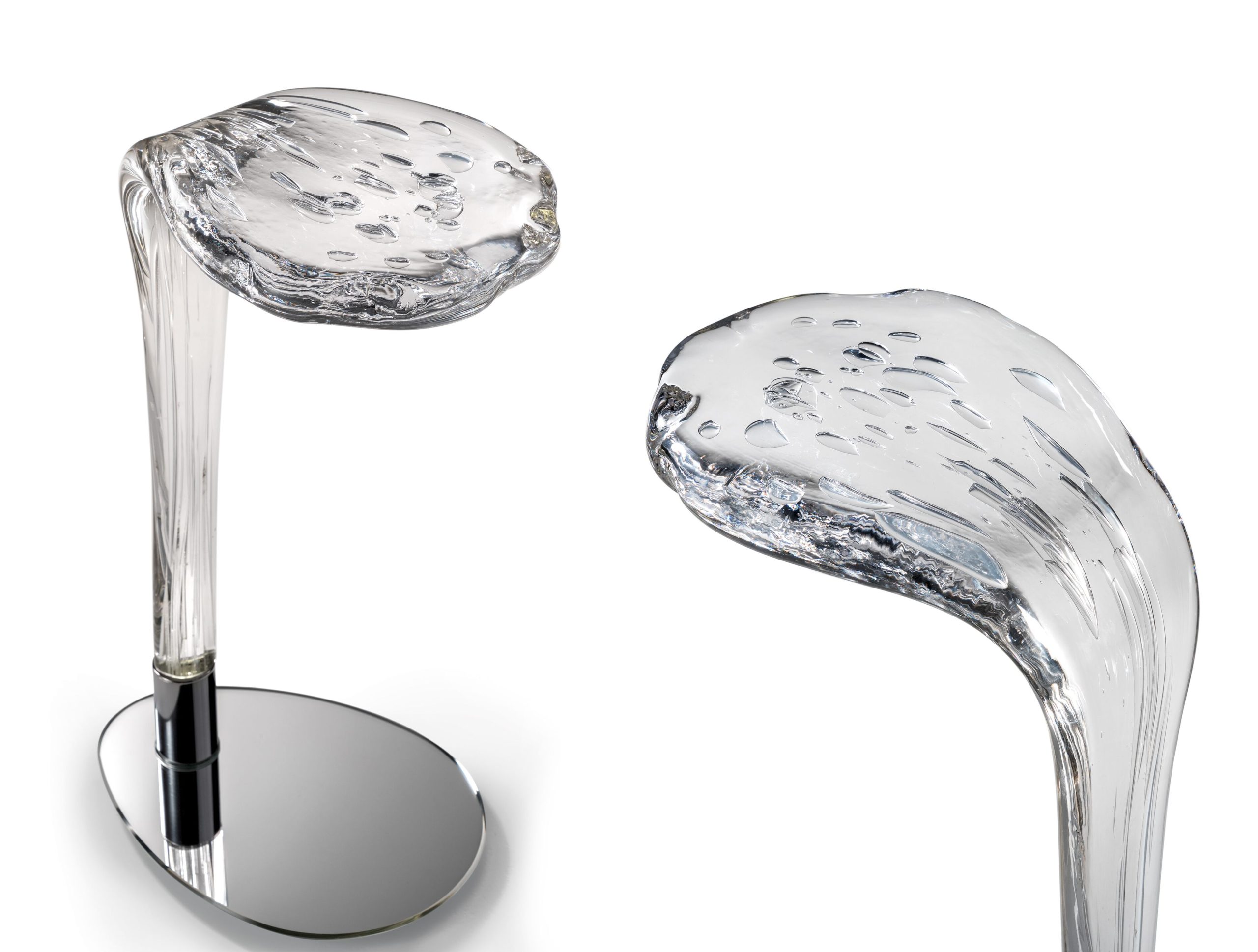 Loto 40 is a side table/lamp in transparent Murano glass. Base in extra-clear mirror glass and support in shiny steel. LED spot