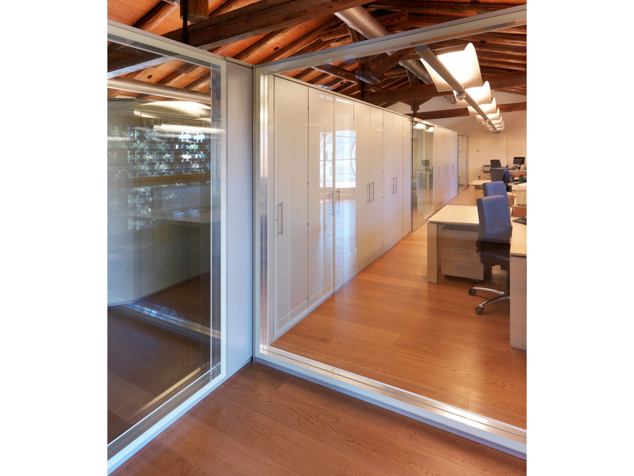 LUCE is a mobile, modular dividing wall system that can be equipped according to need. It features a stand-alone internal metallic structure and independent opaque and/or glass external panels fixed using an exclusive patented click-on system.