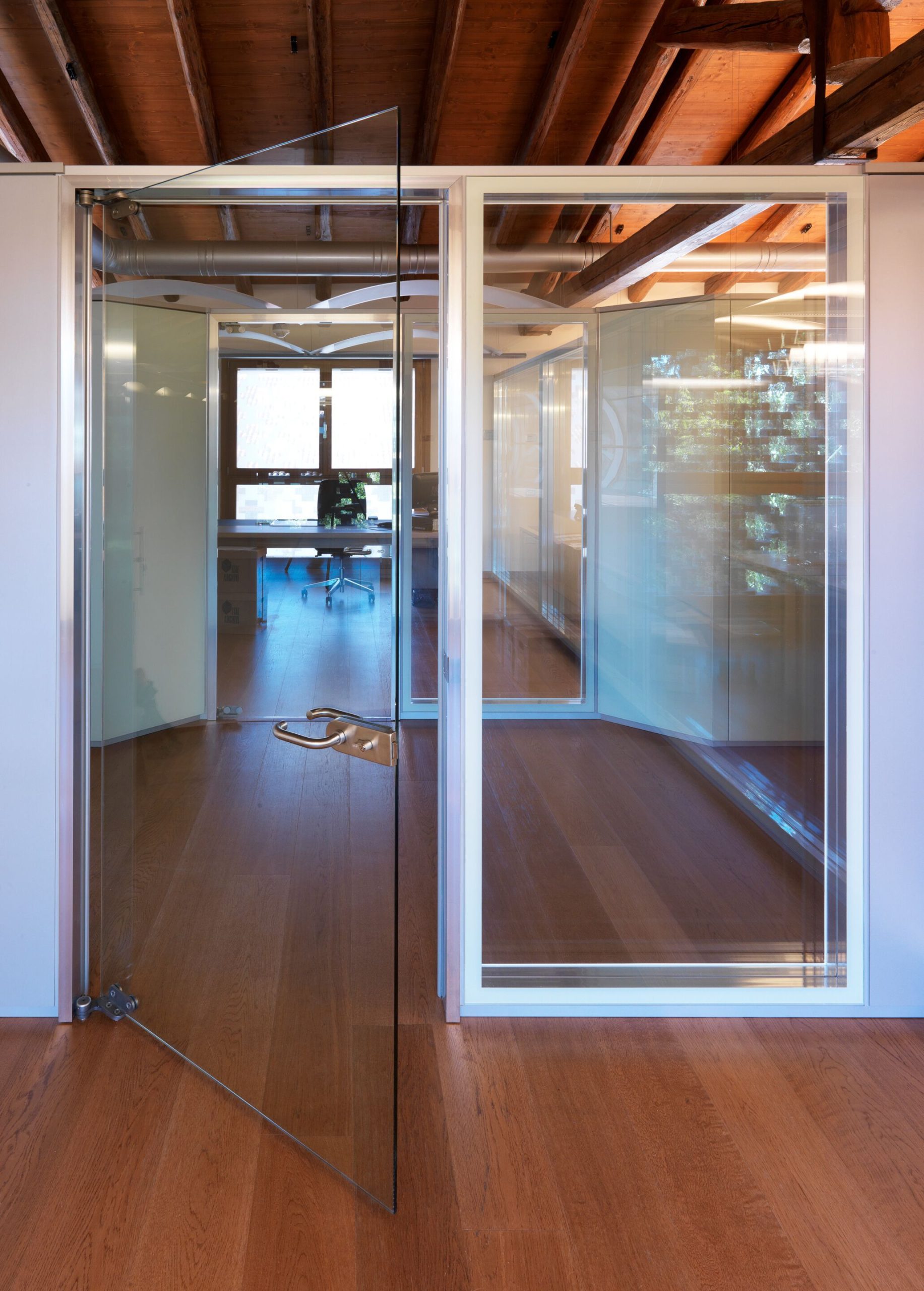 The doors of the LUCE walls are made with pre-treated extruded aluminum profiles with gaskets on three sides, and they are adjusted in their thickness so they can be clicked on to the weight-bearing structure to be fixed using invisible screws. The hinged doors are made with double glass that is 6 mm thick, glued to the aluminum structure on the finish, and they come with hinges and locks, plus a wide range of accessories, knobs to choose from, and the possibility to use an invisible automatic door-closing mechanism on the outside or at floor level.