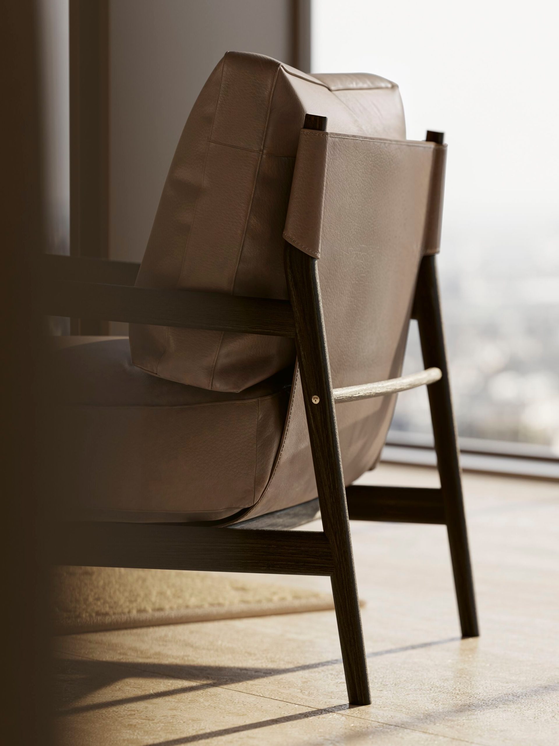Its expressive character tells the story of the beauty of living and natural materials like wood and leather. The soul of Maddix is indeed the fascinating dialogue between these two elements: the light wooden frame, with shaped profiles, supports the backrest in light hides.