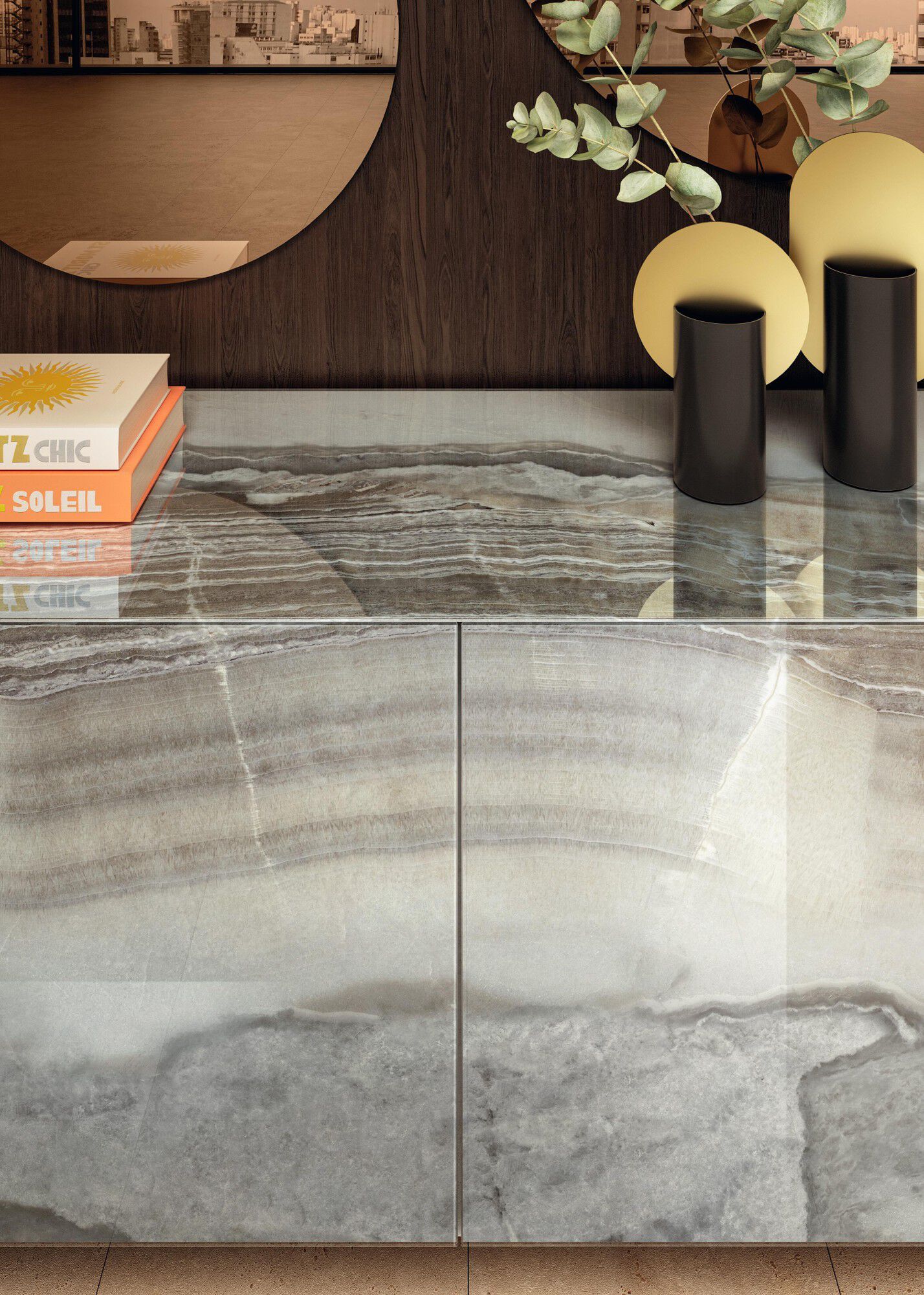 individual panel allows you to generate limitless chromatic moods. Accent lighting features in this clear, bronzed-effect glass door design with a 45° finish and built in without any visible supports. This creates a warm glow and gives the items on display a sense of importance. Storage solutions with width measurements in increments of 20 cm, available in 4 heights, for every area of the home.