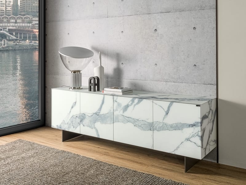 The rhythm created by the glass panels alters the traditional perception of storage space, hiding a patented and timeless opening mechanism. The option to customize each