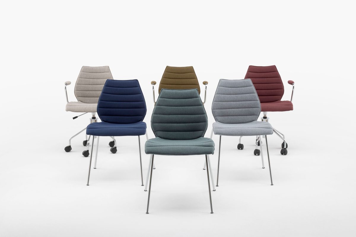 The Maui chairs form a family with a rich variety of colours and shapes, both hard and soft, capable of satisfying specific needs, at home or in professional environments. Maui is available in the new Noma fabrics created 50% with recycled fibres. The fabric meets all European fire safety standards. Kartell has chosen six different colour variants to include in the catalogue, all of which are available now, but offers the whole range of colours as Client Fabric. Kartell Noma stands out for its attractive, yet hard-wearing and versatile two-town mlange design, its excellent resistance to fire and its environmentally-friendly appeal.