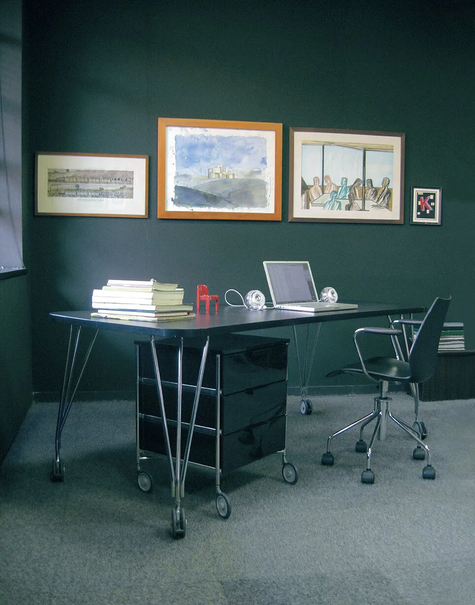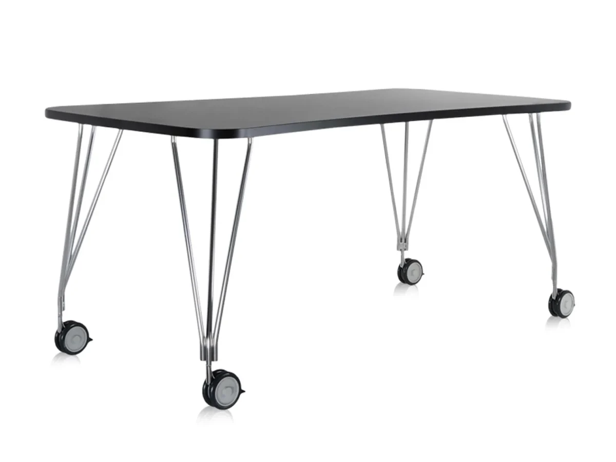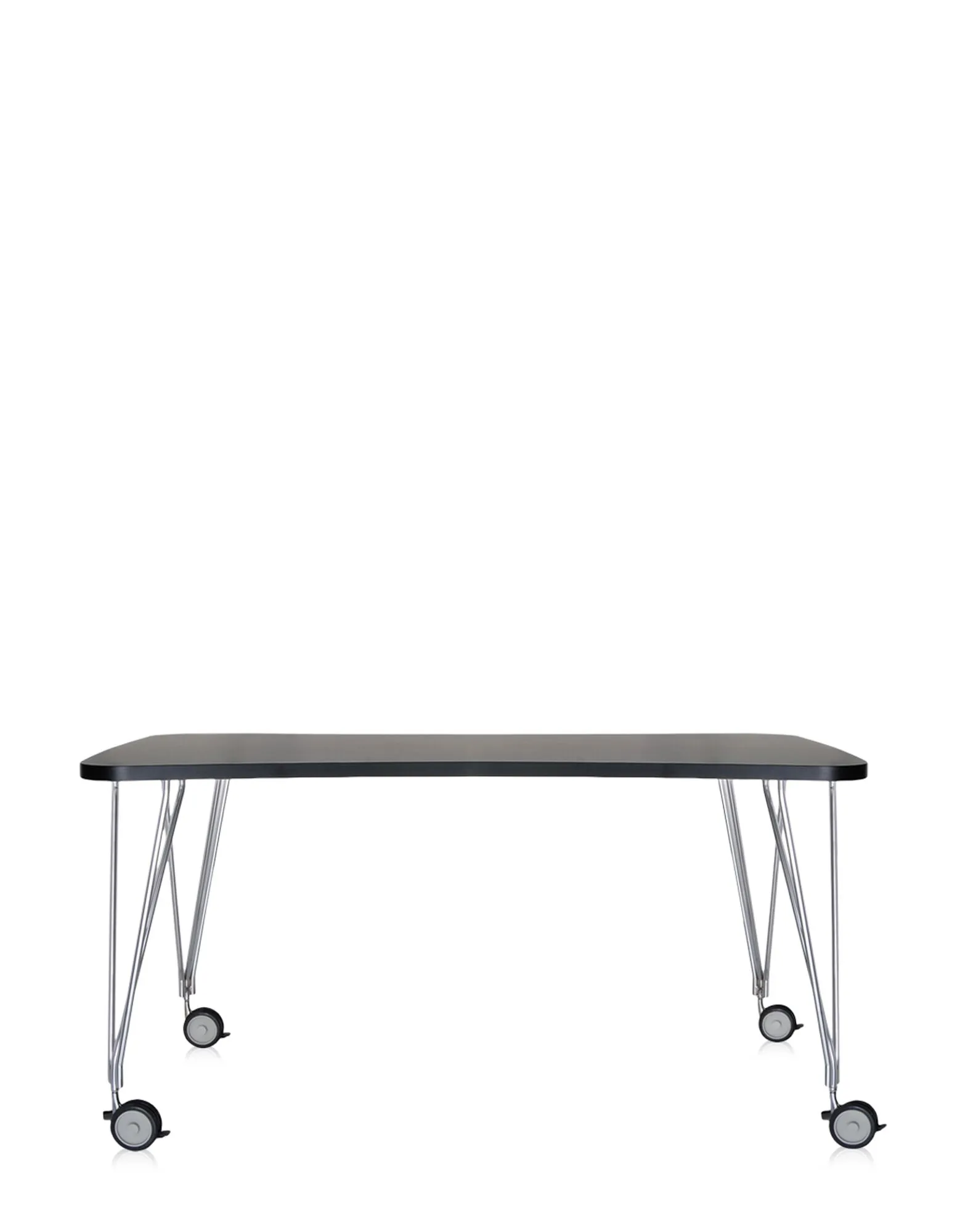 Max is a study table, born for the office. The gentle, hourglass shape allows Max to sit side-by-side with tables of the same type as well as with other office furnishings. It can stand alone as a single workstation or together with companion pieces, creating work islands for open office spaces. The match-up combinations are easy and quick, thanks to its lightness and mobility, as demonstrated by the leg structures. Three metal tubes in chromed steel join at the base to form castors or feet. The castors are also equipped with auto-lock brakes for stability.