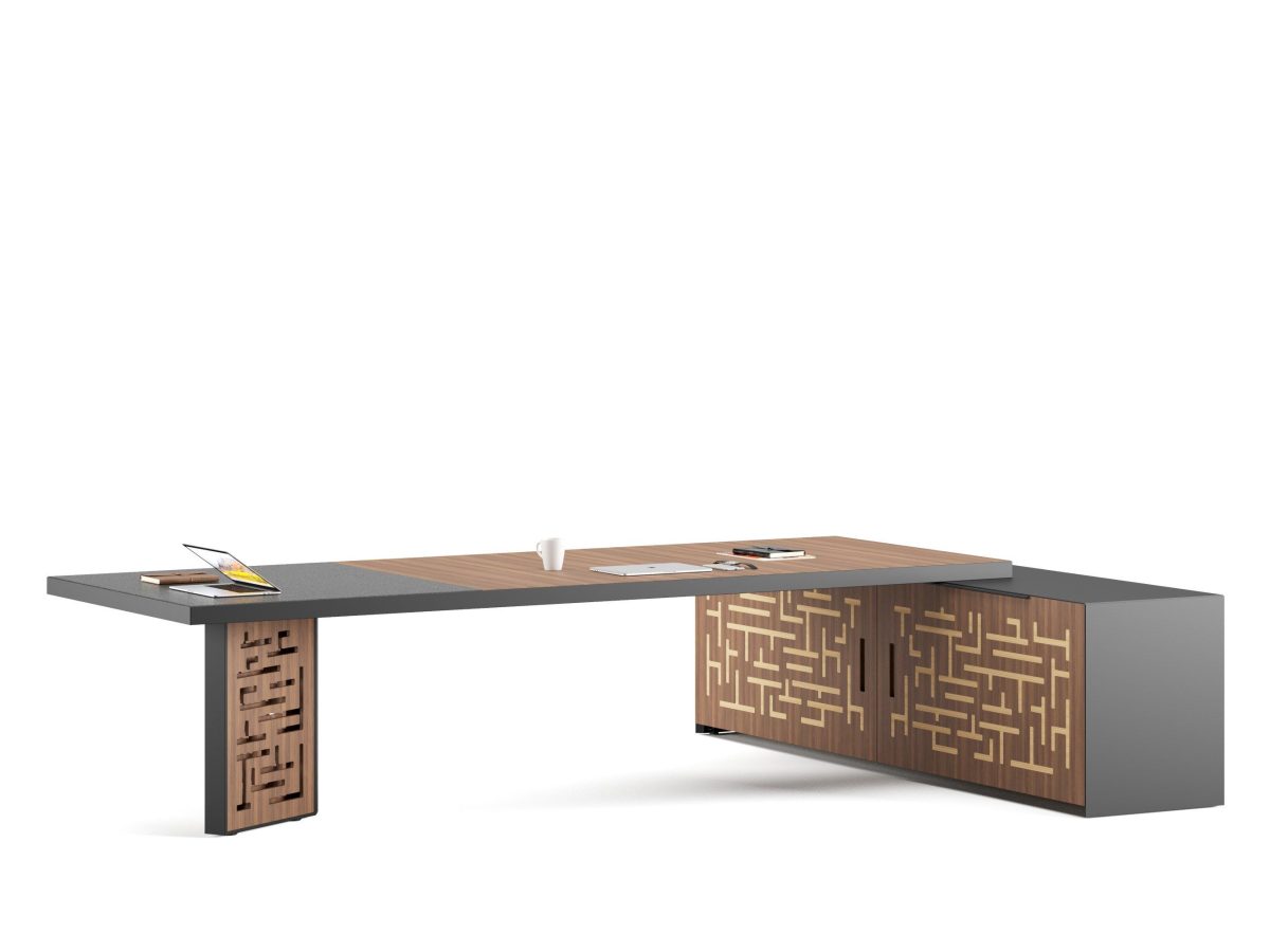 MAZE By Ersa is a executive desk made with the wooden top veneered on one side and painted with epoxy resin on the other; the front panel also painted, separates the wooden legs veneered and perforated with geometric patterns, supported by an aluminium core.