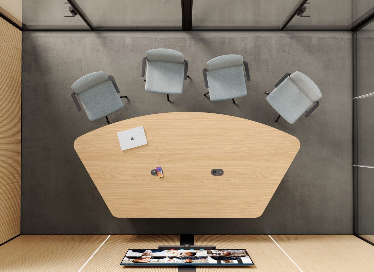 Open-plan spaces increasingly require private areas for temporary work stations, meetings or videocalls: an acoustic oasis within the modern office. With this in mind, Meet Up offers a height adjustable meeting table solution suitable for videoconferences. Its round shape ensures all videoconference participants are visible.