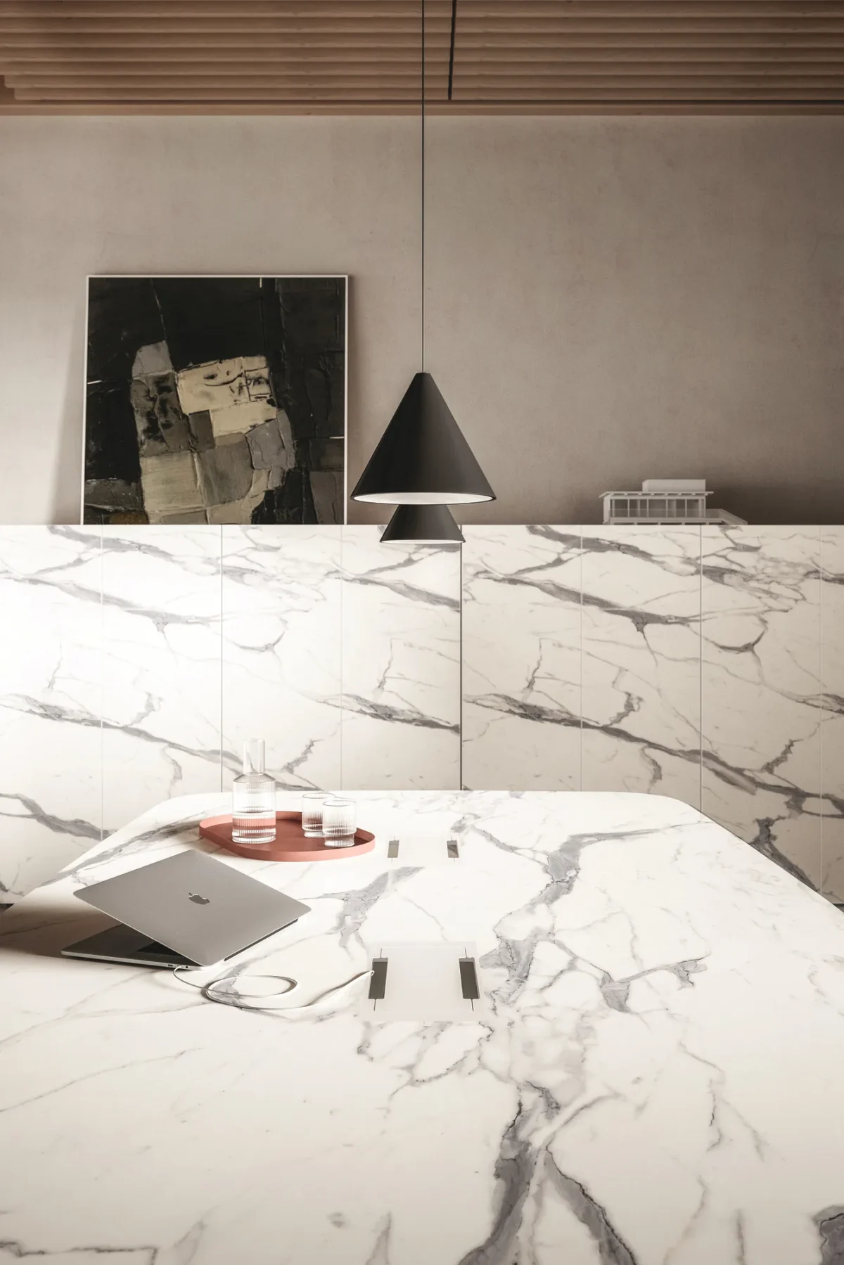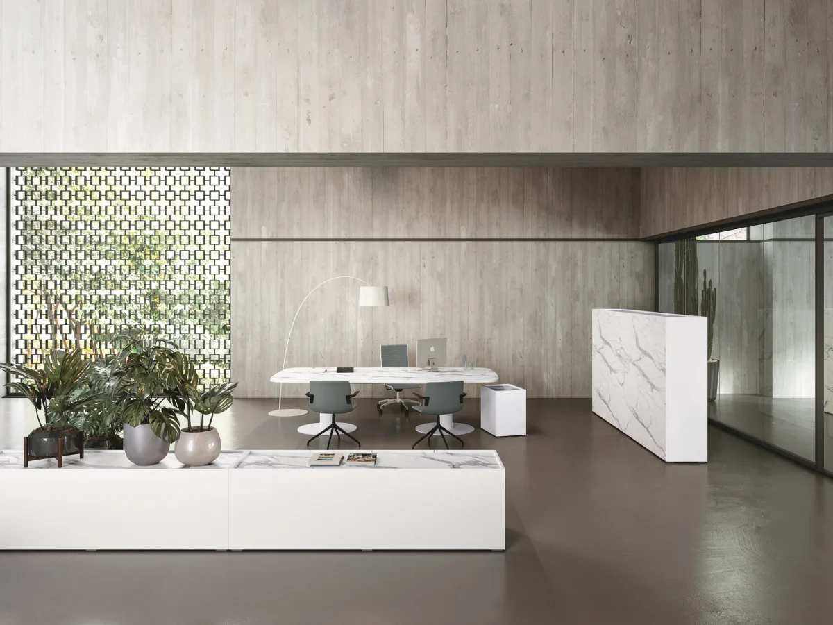 The Meet Up collection is a child of our times, born to embrace the design changes and varying needs for socialisation in the office world, while leaving traditional patterns and roles behind. Its design reflects the evolution of the executive space, less and less individual, more and more meeting-centred, with a newfound vocation for functionality and essentiality. The centrepiece of the collection is a series of convivial round tables, most of which are height-adjustable. Combined with monolithic cabinets featuring clean shapes and lines, the resulting rooms are strongly characterised by the choice of marble decor and sustainable raw materials.