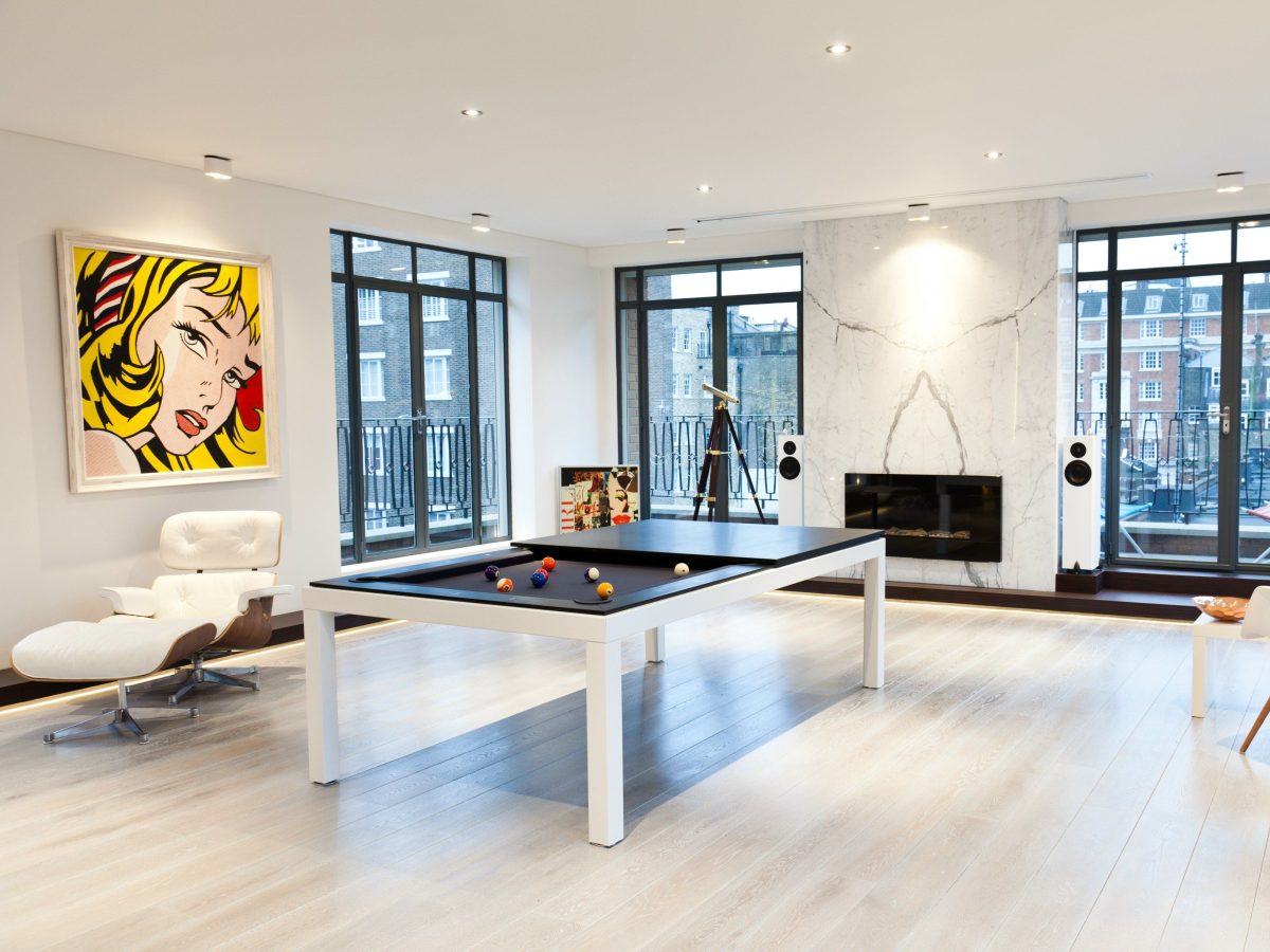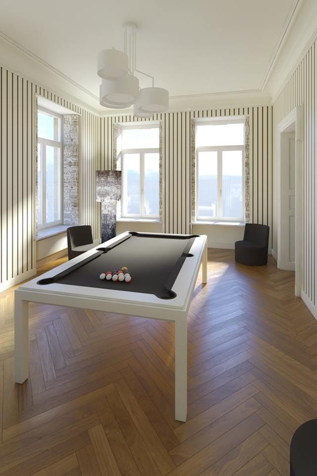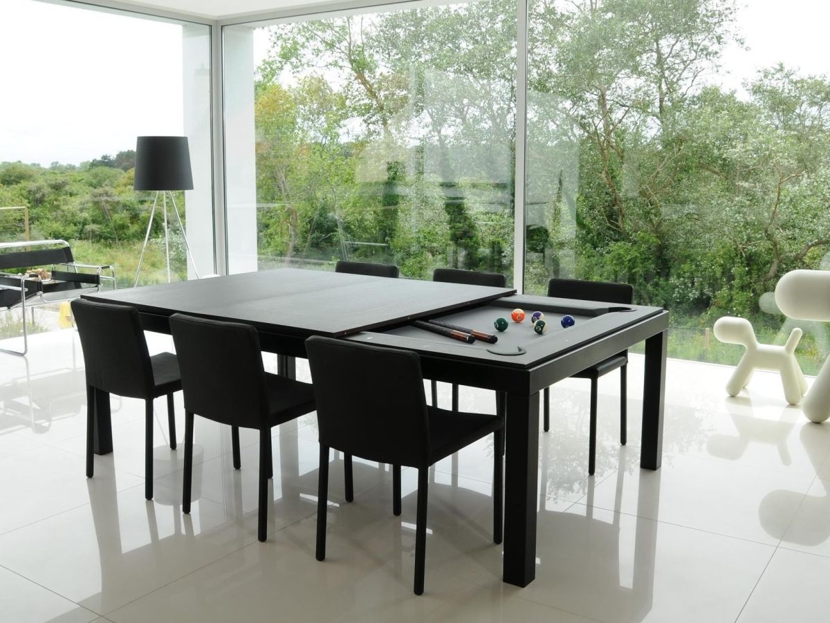 More than a contemporary dining table, the Fusion table is a new dimension for your dining room. Inside this timeless modern, sleek, airy design table the table offers an high quality 7 foot american pool table, a game, poker or roulette table.