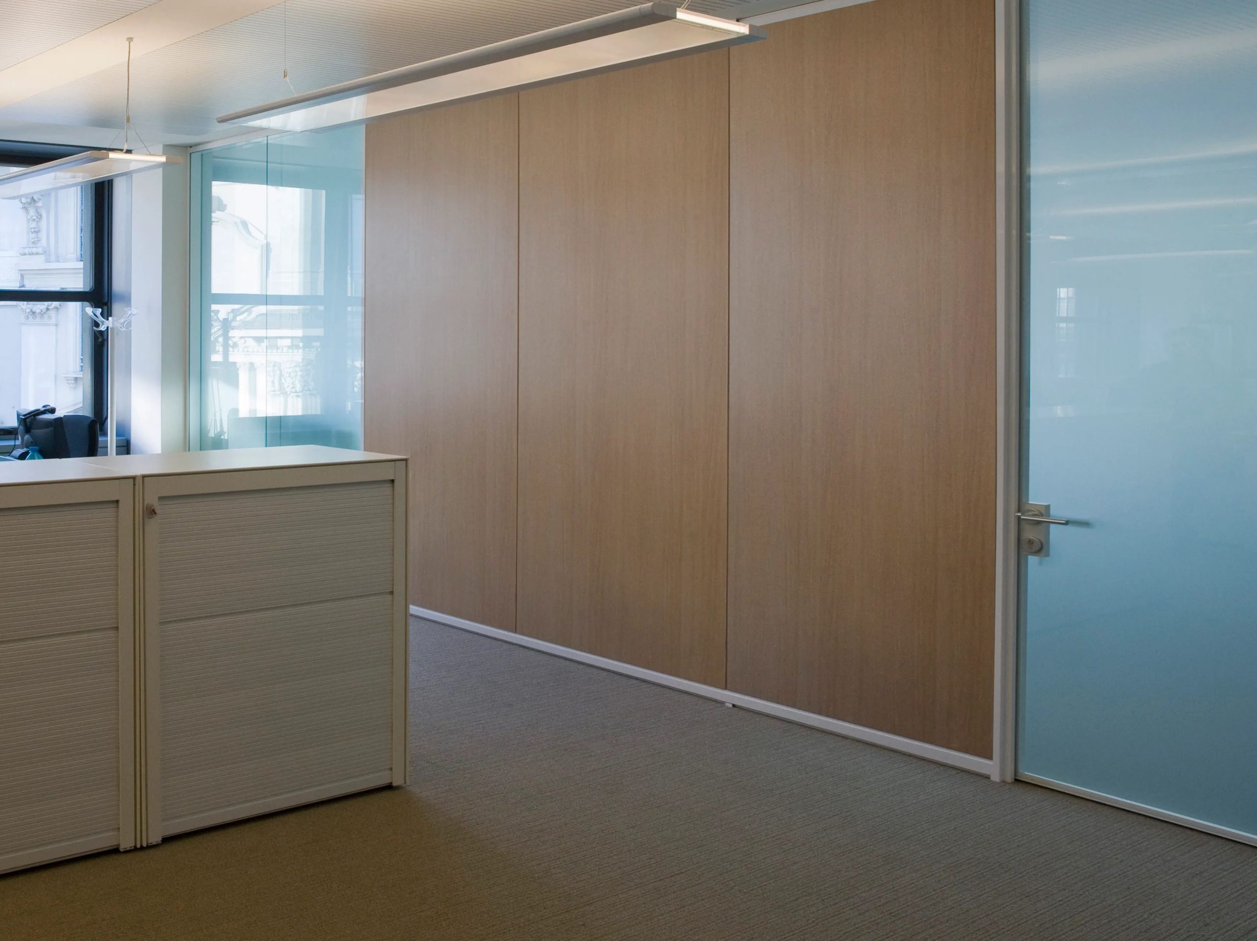 The standard panels are produced in fire retardant melamine faced MDF. They are available in five modern and trendy wood types, with an extremely natural surface essence finish. It is also available in withe colour, slightly embossed finish. On request the panels can be produced veneered in natural or multilaminar wood or painted RAL colours or sample with fireproof varnishes.