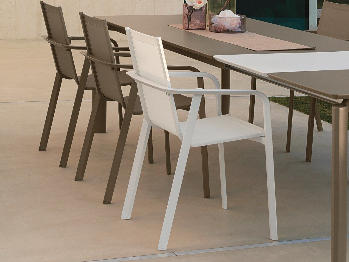 Stackable dining chair with aluminium frame and textilene. Optional cushion in light grey or dark grey.