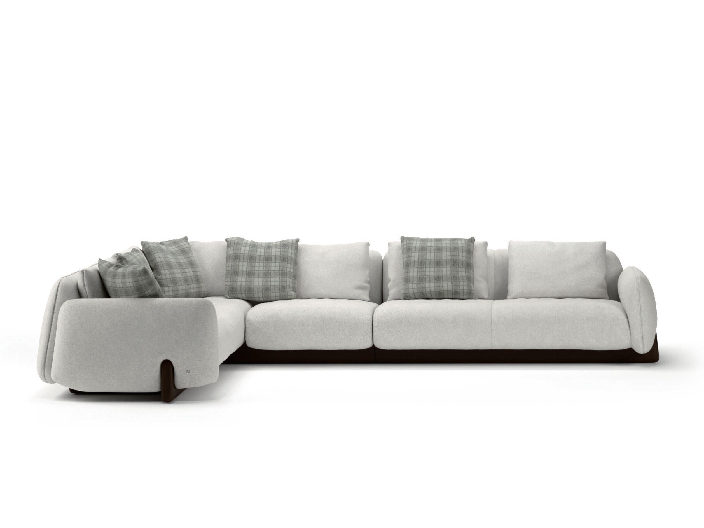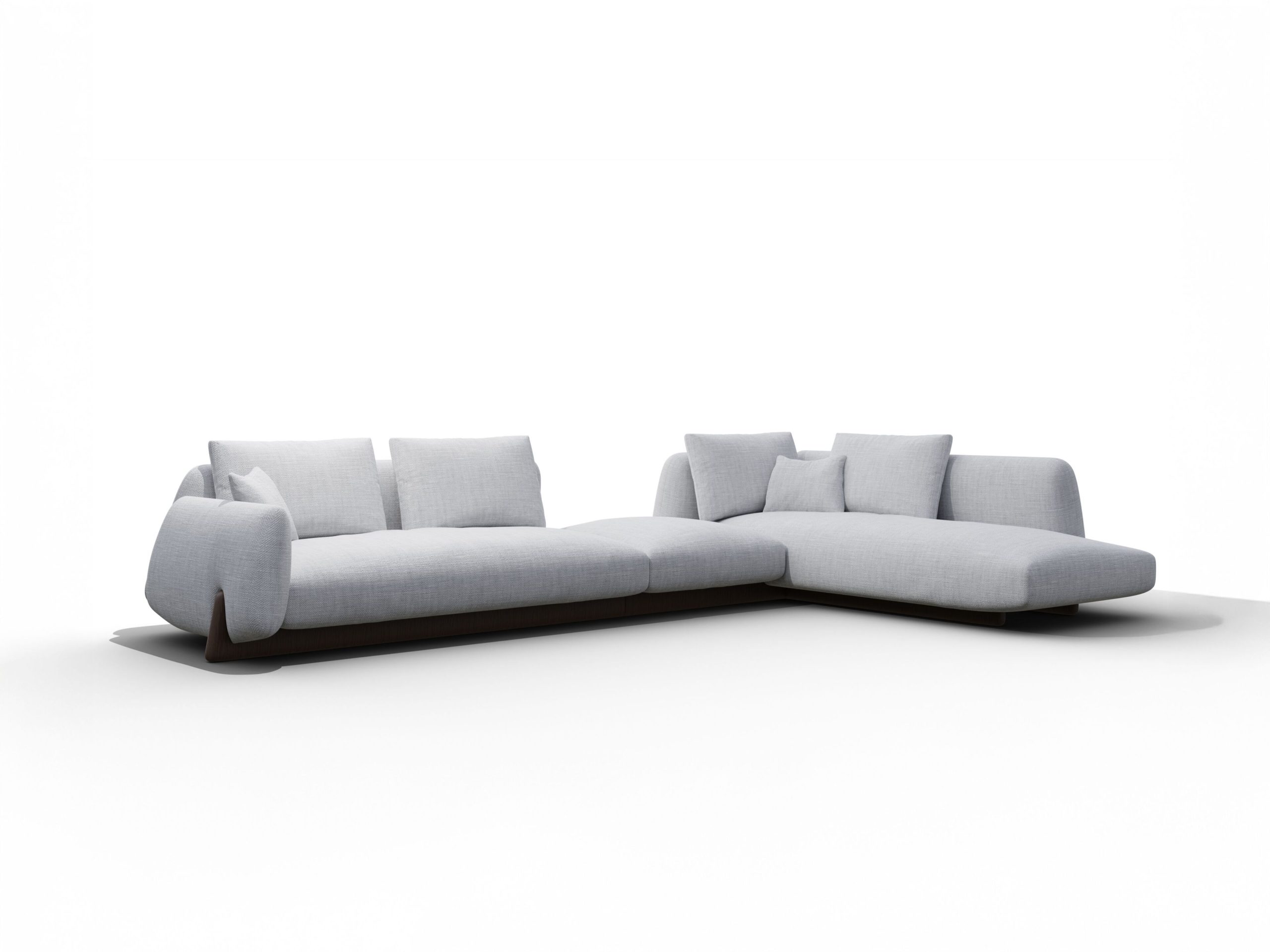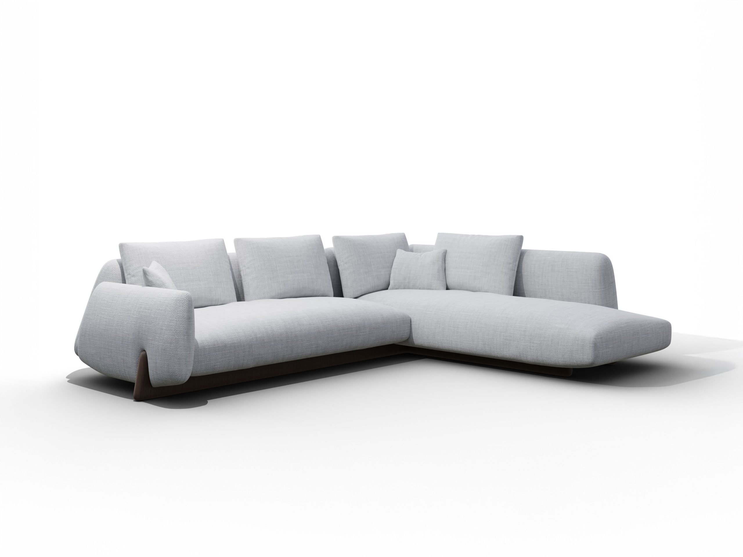 Mirai is a corner sectional fabric sofa. For his new project in collaboration with Natuzzi Italia, Andrea Steidl draws inspiration from the 13th-century Federician architecture of Puglia. Like the grand Federician castles, Mirai possesses a structure with strong yet light personality, blending architectural depth with contemporary softness. Through clever optical illusion, the sofa’s lines, akin to the castle’s, seemingly diverge before converging in perpetual, repeated elements, crafting an imaginative, moving texture. In this refined seating, individual elements are held together by a neat wooden structure supporting light, soft volumes. The sofa’s three fundamental elements—cushion, backrest, and armrest—playfully vary in height, enhancing visual comfort. Reflecting the timeless creativity symbolized by Federico II, the project embraces a forward-looking mindset, mirroring Puglia’s enduring beauty and its gaze towards tomorrow.