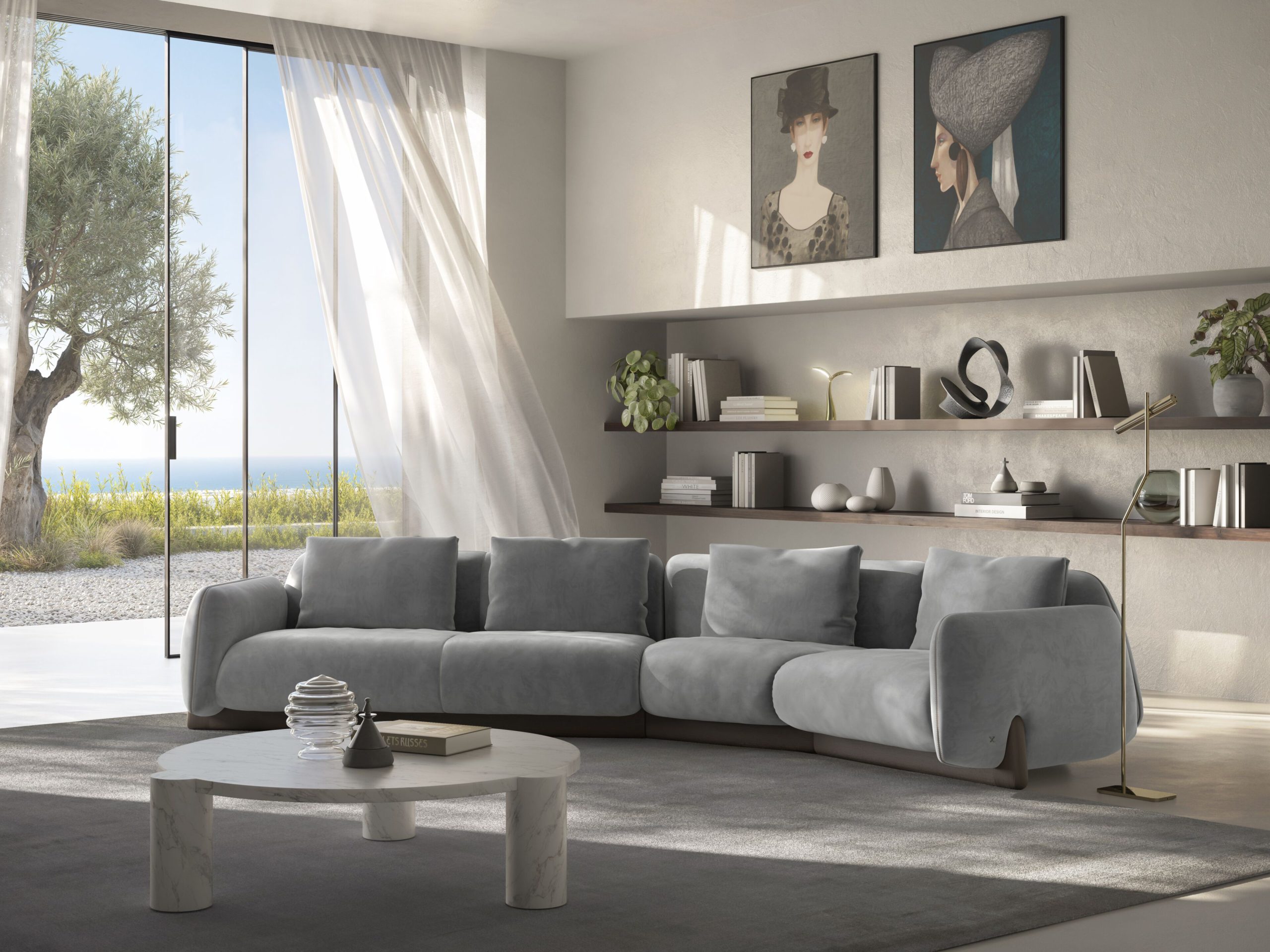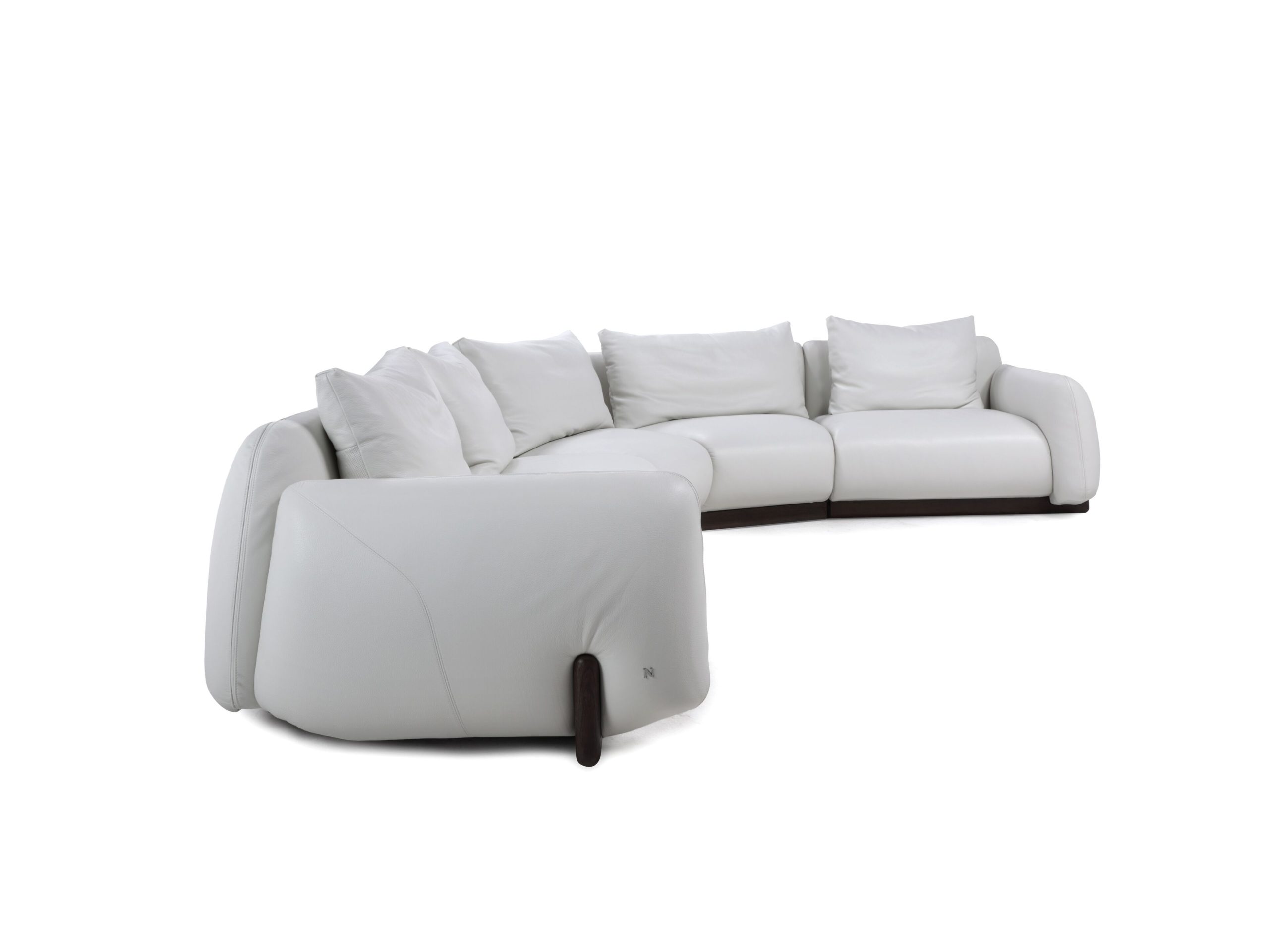 Mirai is a corner sectional leather sofa. For his new project in collaboration with Natuzzi Italia, Andrea Steidl draws inspiration from the 13th-century Federician architecture of Puglia. Like the grand Federician castles, Mirai possesses a structure with strong yet light personality, blending architectural depth with contemporary softness. Through clever optical illusion, the sofa’s lines, akin to the castle’s, seemingly diverge before converging in perpetual, repeated elements, crafting an imaginative, moving texture. In this refined seating, individual elements are held together by a neat wooden structure supporting light, soft volumes. The sofa’s three fundamental elements—cushion, backrest, and armrest—playfully vary in height, enhancing visual comfort. Reflecting the timeless creativity symbolized by Federico II, the project embraces a forward-looking mindset, mirroring Puglia’s enduring beauty and its gaze towards tomorrow.