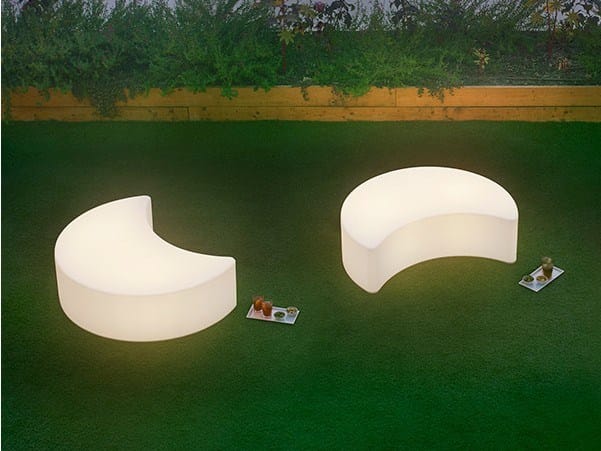 To create dreamy atmosphere that reminds “Arabian Nights”, Moon is an inimitable furniture. Its moon shape is ideal to furnish gardens, terraces and outdoor spaces with a romantic and informal style. Moon pouf is made in polyethylene and it is luminous: its simple and sinuous design is ideal for contemporary outdoor contract, events, retail and private houses.