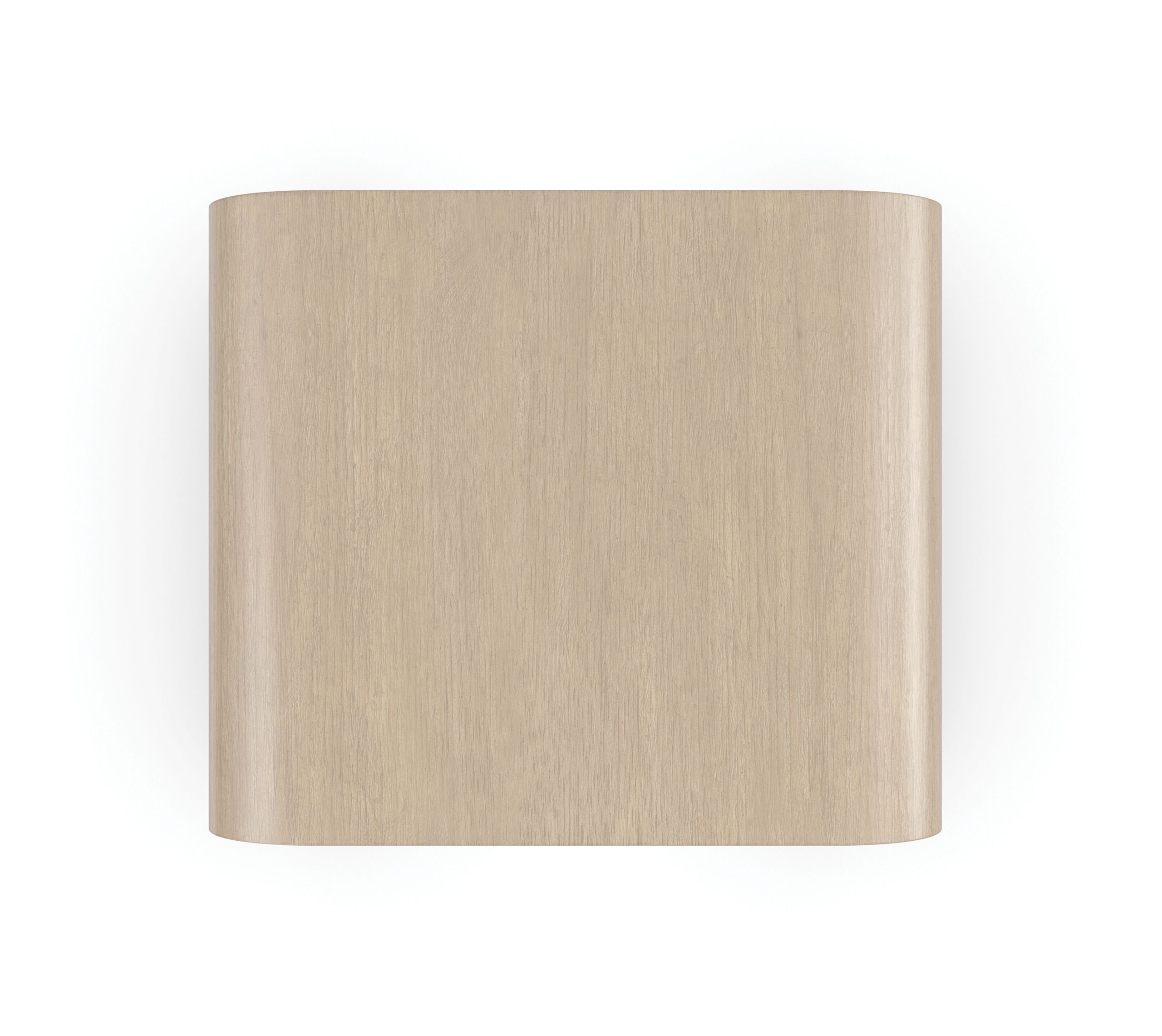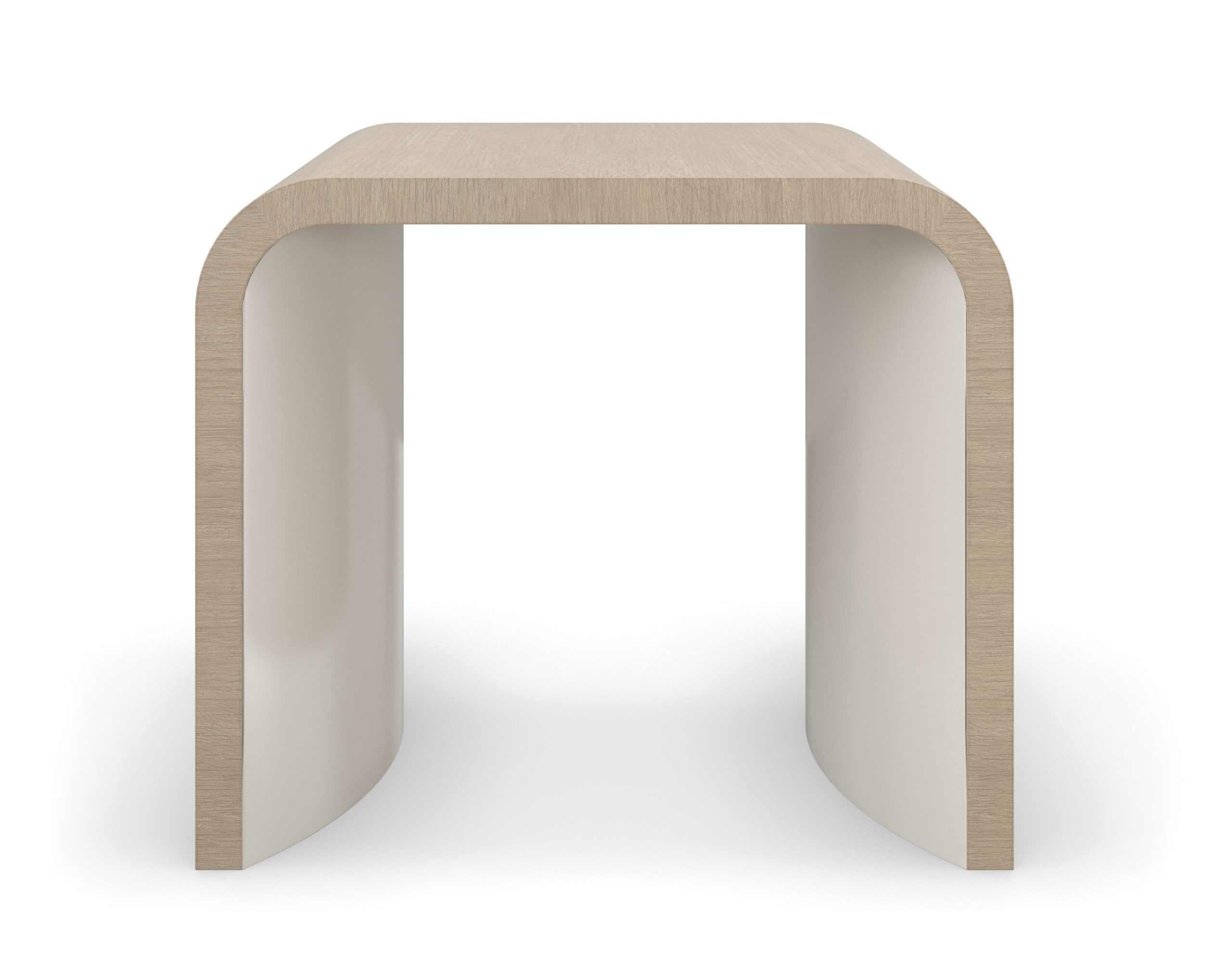 Sleek in its simplicity, Movement end table evokes a sense of calm and organic fluidity. Crafted in Sun Drenched Oak, its ample top gracefully waterfalls over either side. Semi-circular legs are finished in Textured Adobe for added tactile appeal and subtle contrast. Style in pairs to create movement and soften clean modern lines.