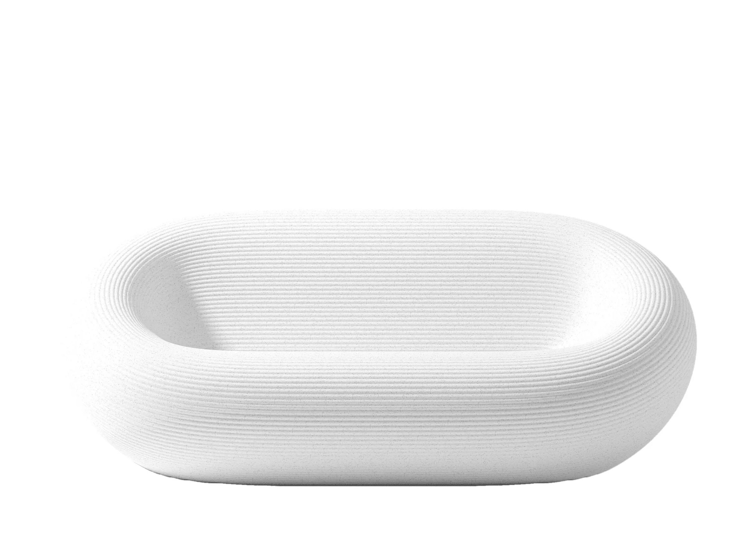 The Nami sofa is characterized by a linear shape in the center but circular at the two ends, perfectly on both sides. In the middle part of the sofa there are two channels for water reflux. Allows seating of 2/3 people. Available in three colours obtained from recycling and mixing materials with 2/3 different color tones: stone white mix, warm gray mix, sage green mix.