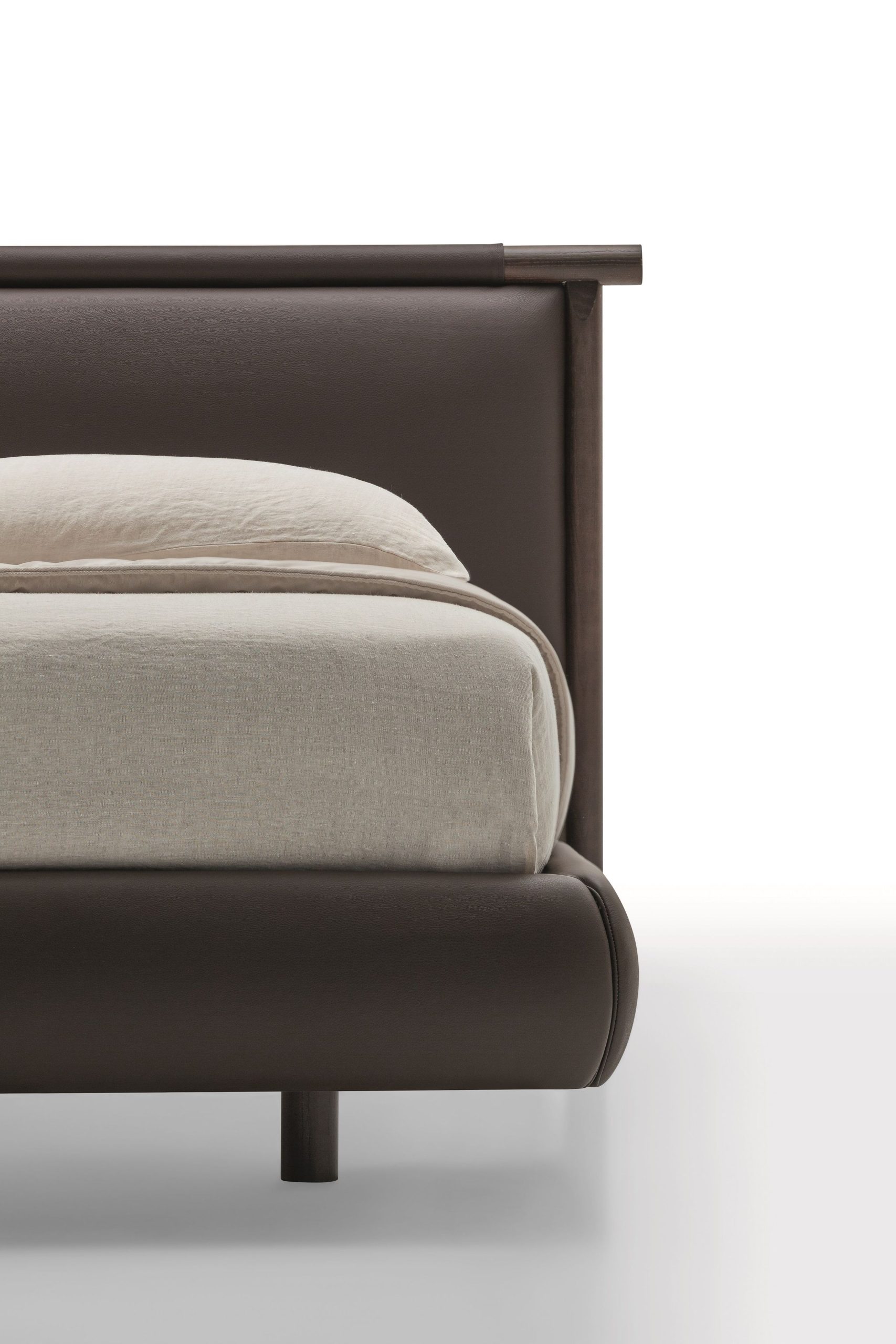 The Nathan bed boasts an iconic, wooden structure upholstered with a sheet of leather on the headboard which designs and defines its shape while accommodating soft cushions and making the bed sturdy and comfortable.