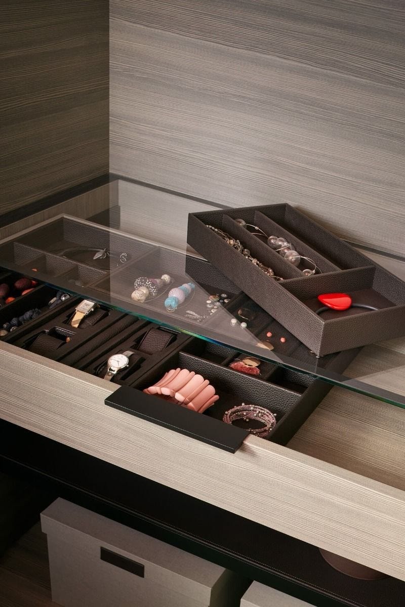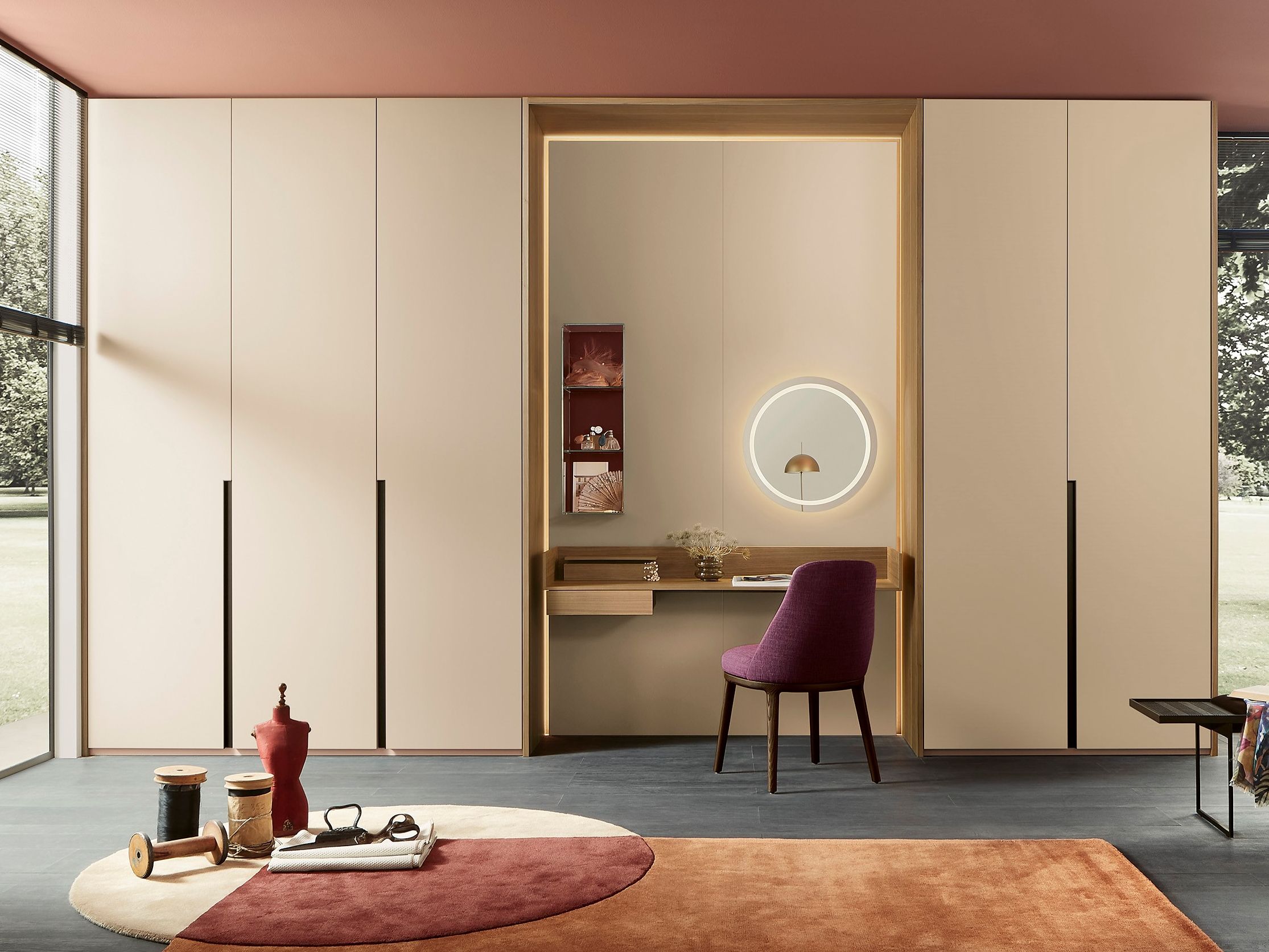 Customisable in height, width and depth, it offers multiple possibilities for personalising the interior. The Armadio al Centimetro programme offers a range of different finishes and stunning features designed to accommodate specific functional requirements. These include drawers, racks for trousers, belts and shoes, shelves and clothes rails with integrated lighting solutions. It also offers precious detailing in leather and fabric, such as drawer mats and boxes for shirt racks.