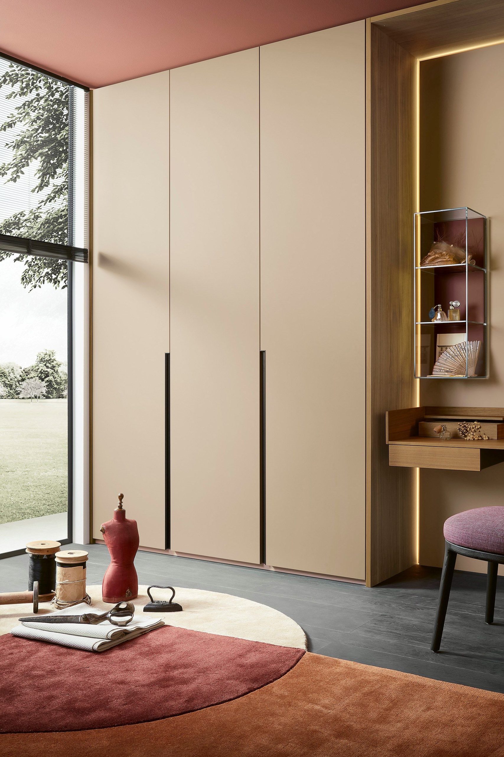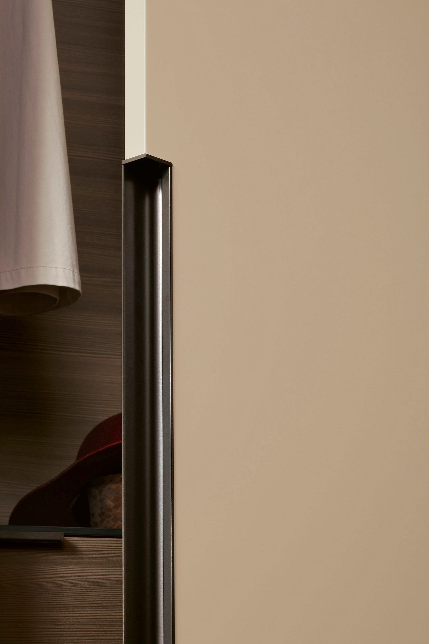 Available with hinged doors, Next wardrobe is characterised by elegant vertical metal handles which enhance the surface of the door. Armadio al Centimetro offers a wide choice of panel finishes: melamine, matt lacquered, carbone oak, noce-L and thermo-treated oak to which the recessed handle can be combined, available in bronze painted metal or matt lacquered.