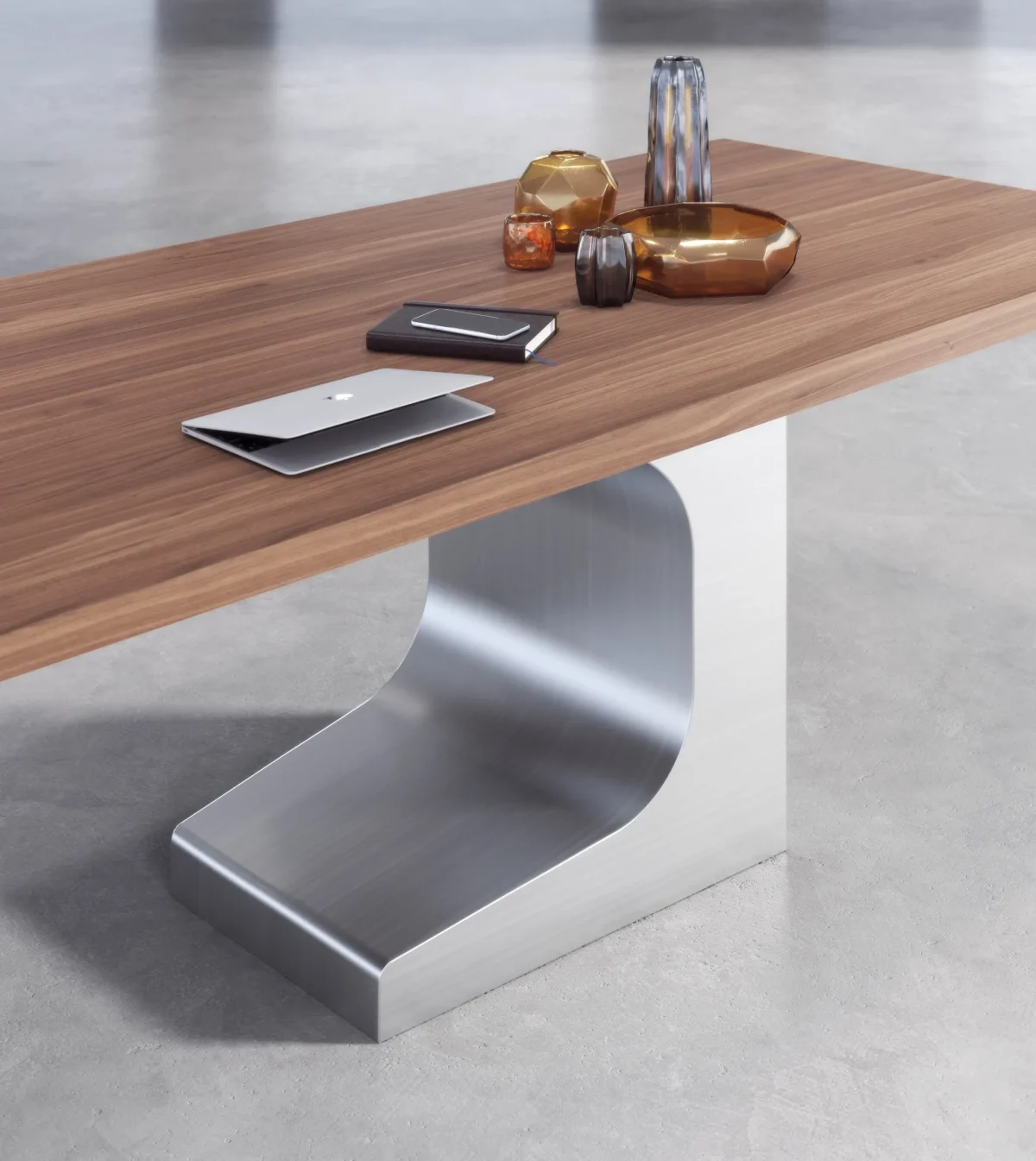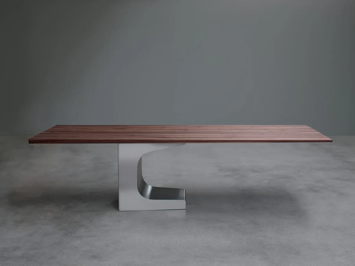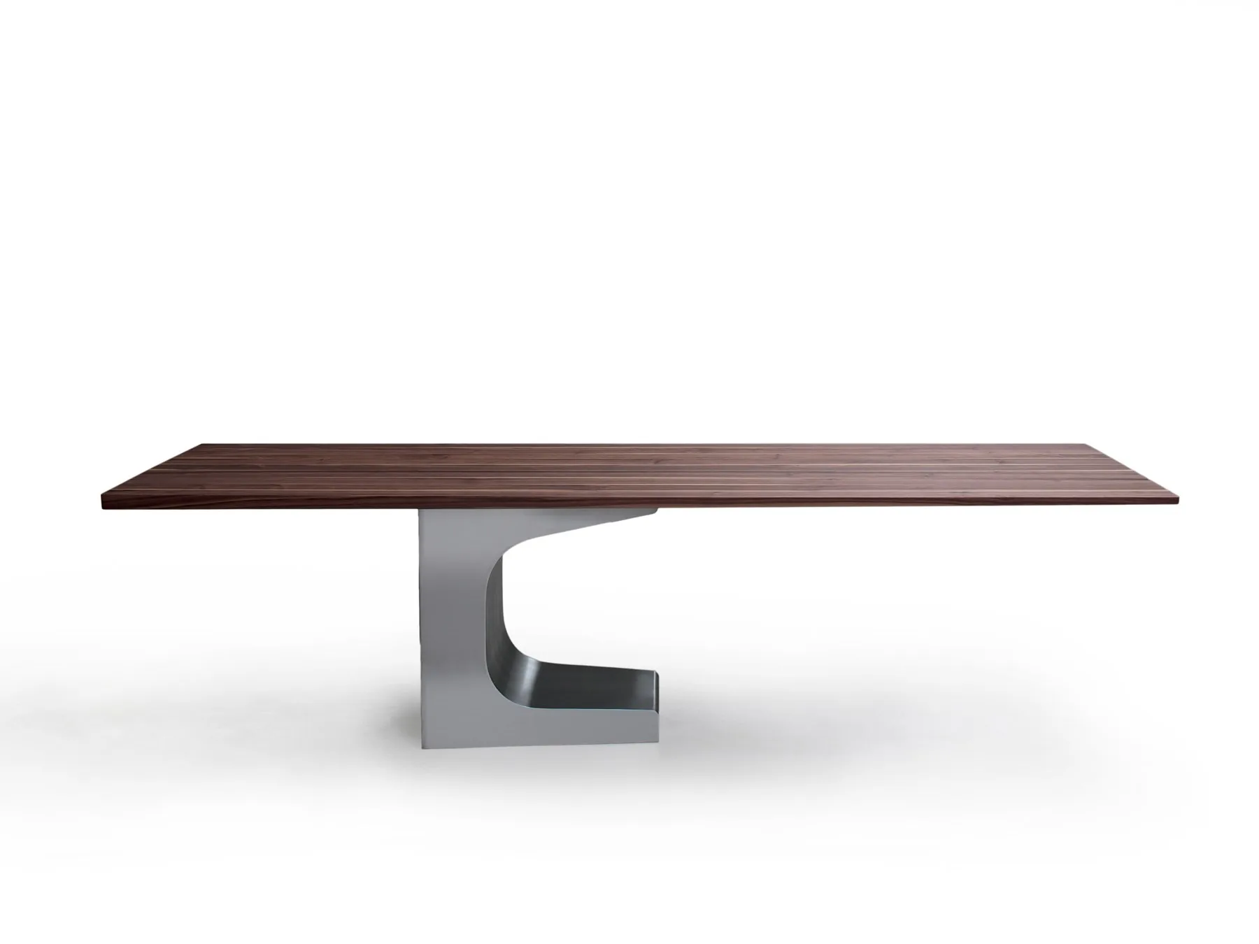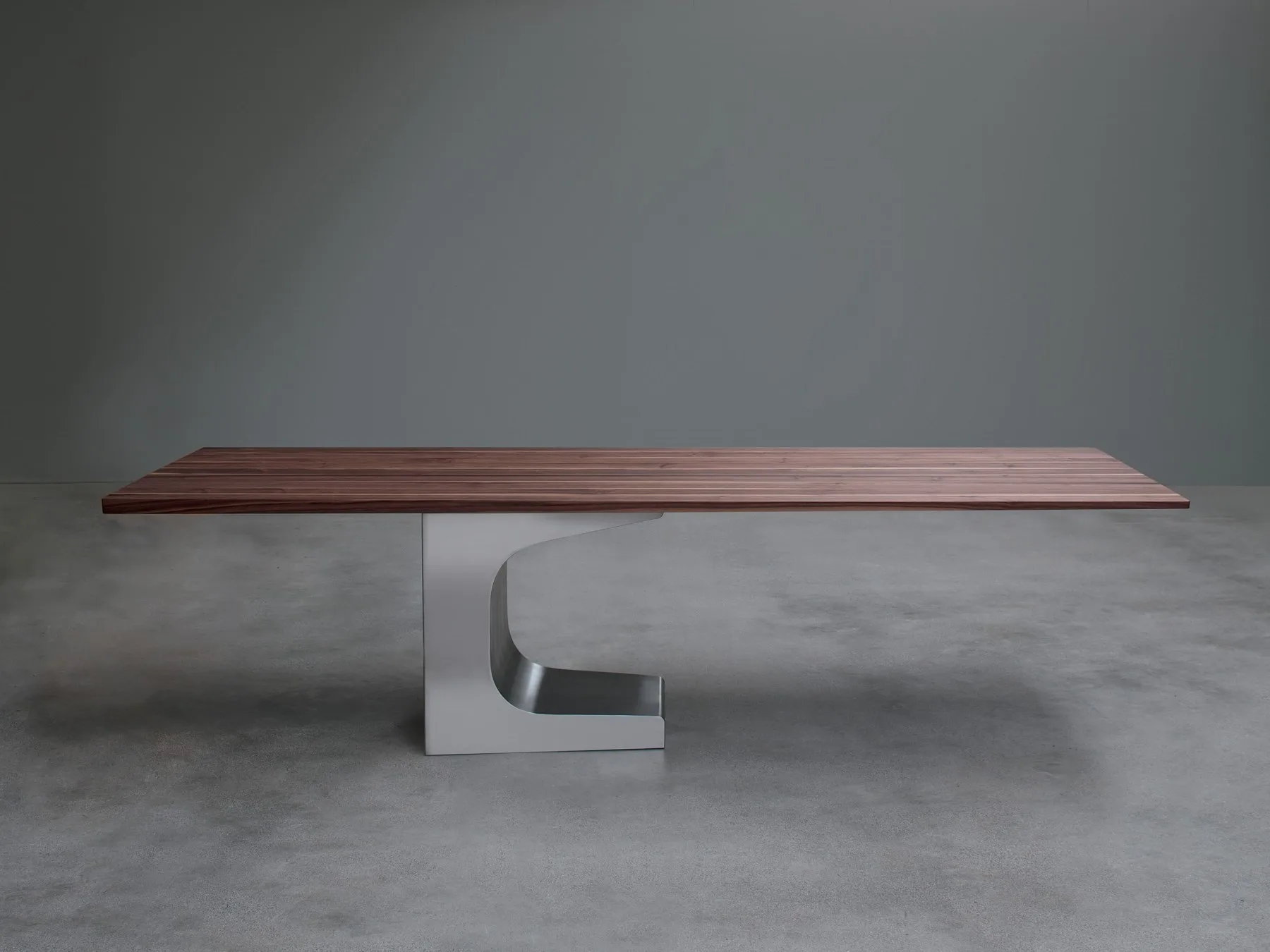 The table top, with a maximum length of 280 cm, can be made of solid wood or glass and is supported by the characteristic curved wooden base, covered in satin stainless steel.