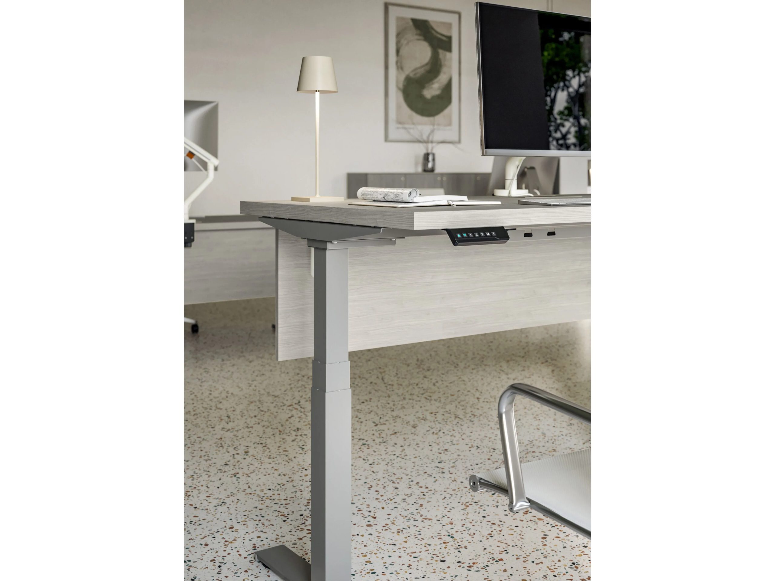 Giessegi’s electrically height-adjustable desk has a Grey lacquered metal base and top that can be produced in the finishes White, Knotty Oak, Cloud Ash, Ash Wood and Teak or in the various standard lacquered colours.