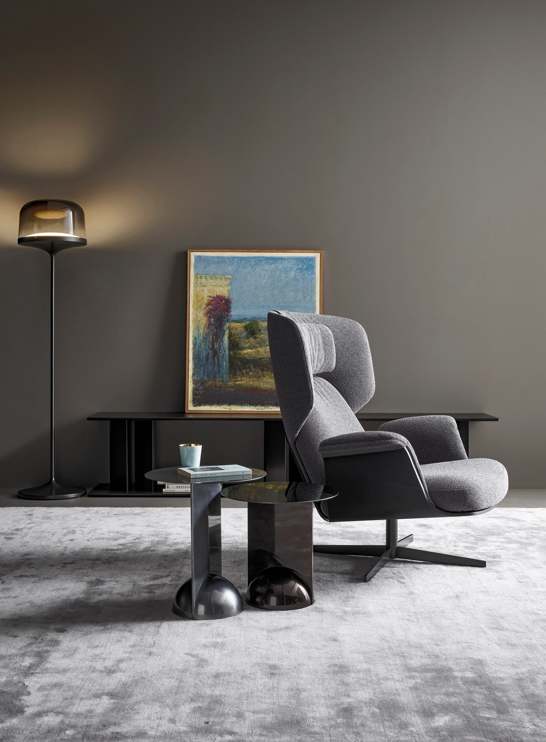 The Olos bergère armchair combined with the Olos footrest complements the Olos collection helping to make it both coordinated and harmonious.The new bergère armchair offers considerable levels of relaxation, characterized by contours that indicate a lifestyle that is elegant, rigorous, serene and casual all at the same time, presenting a reinterpretation of mid-century modern design that reminds us of the authenticity of curved lamellar woodworking. Like a protective shell, the gentle smoothness of the curves of the supporting wooden frame combines with the sinuous roundness of the padding, making the generous level of comfort on offer evident at first sight, welcoming you enticingly with its essential forms.