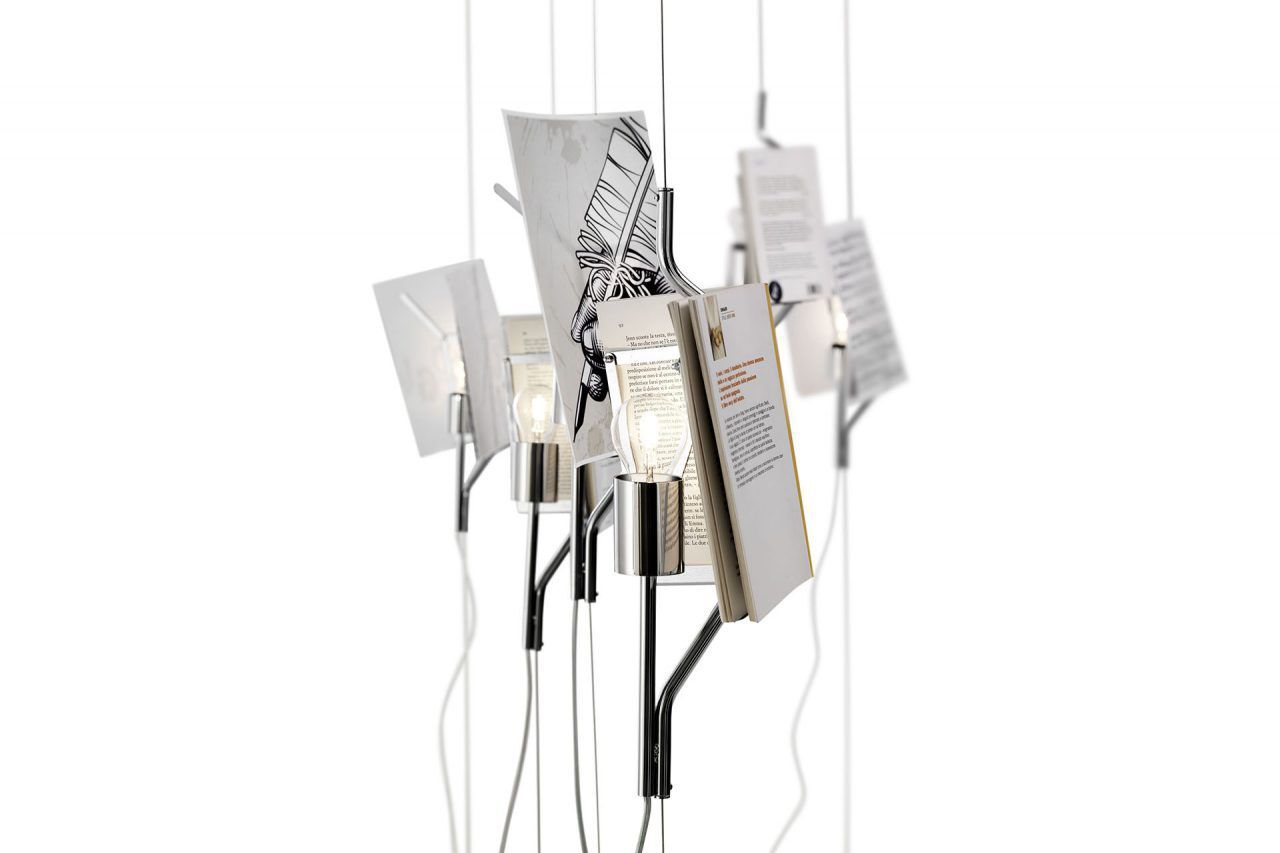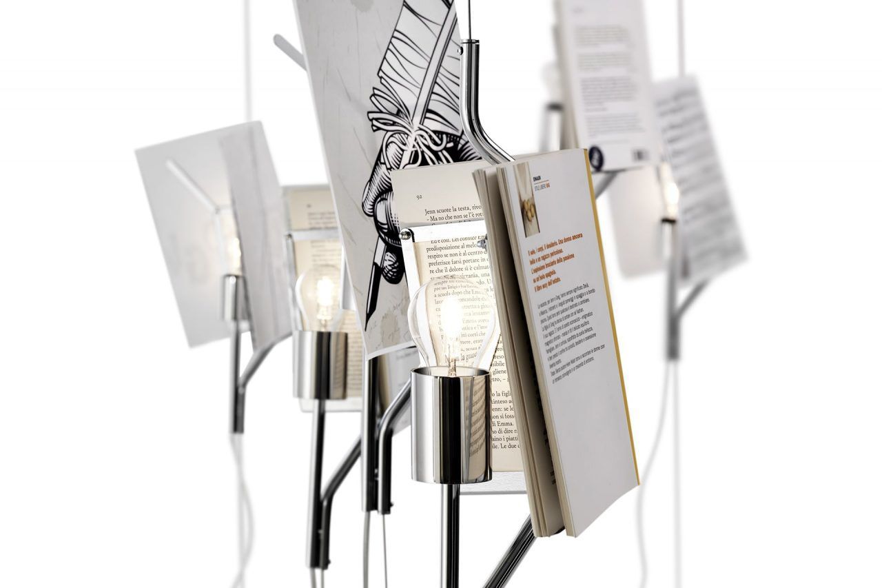 Once Upon a Light is a floor / ceiling lamp made of chromed metal structure with steel cable, base in Carrara or Marquina Nera marble. A lamp, a quote, a game of prestige where one’s book, the favorite book of its user becomes the lampshade, comfortably placed on the special metal bookstop.