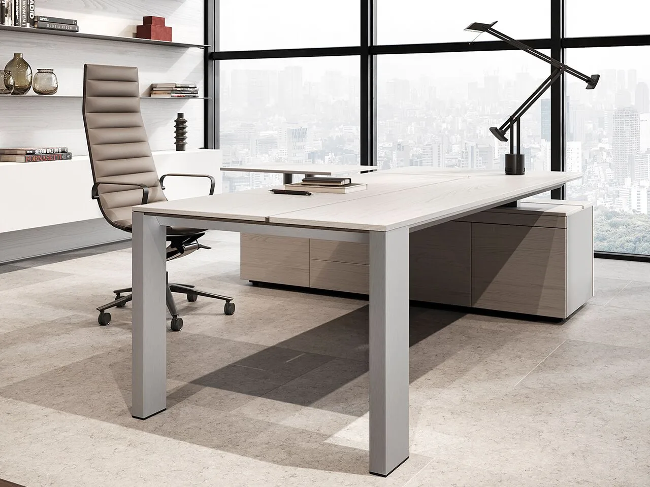 The desk with panelled structure extends and completes the Ono collection. A prestigious desk, with important dimensions, characterised by sober and contemporary lines that combine with the elegance of the materials used. The solid worktop is supported by a metal under-top, hidden by the distinctive aluminium perimeter frame. The worktop is also available with a sliding top for quick access to under-top electrification. The tops are supported by structural side panels with a thickness of 90 mm, processed using folding technology. The inner side of the side panels is equipped with two cable passages, positioned at the top and bottom, which allow vertical wiring of the desk. In this way, it is possible to have a perfectly working space without visible cables. The lower part of the sides is protected and enclosed by a metal sheet into which the adjustment feet are fixed to ensure perfect levelling of the desk to the floor. Top and sides are linked together by the modesty panel that structurally joins the entire composition, giving the desk stability. The Ono executive desk is a functional workstation that can be integrated with the service cabinet. It can be assembled according to your needs with pedestals, filing cabinets and modules with doors, and can be equipped with a small bar fridge with an ice compartment and bottle compartment. The lateral extensions help create additional work space. The extension is closed at the front by a panel that hides the legs but ensures freedom of movement. The 100 cm length is perfectly suited for a variety of activities. The desk is available in a melamine or wood finish, and in the case of sliding tops, the movable tiles can be upholstered in leather.