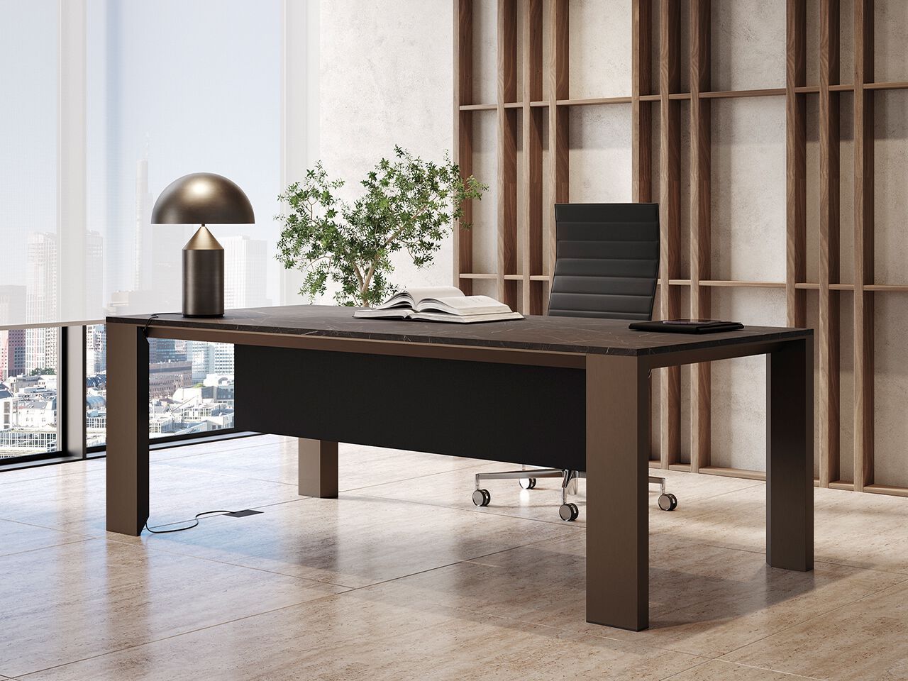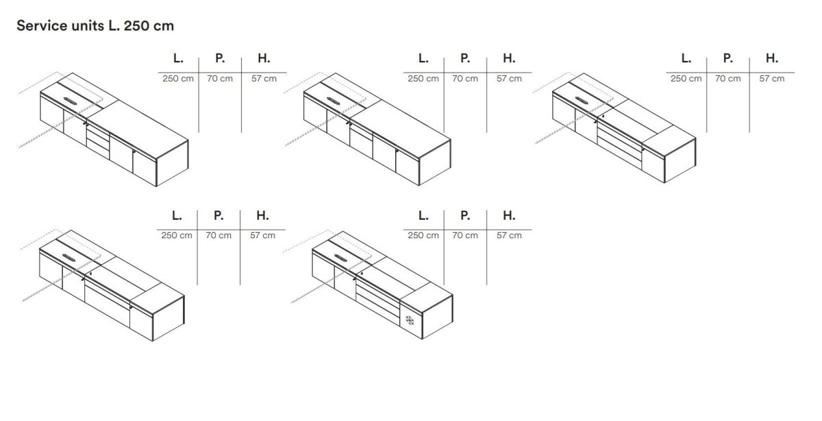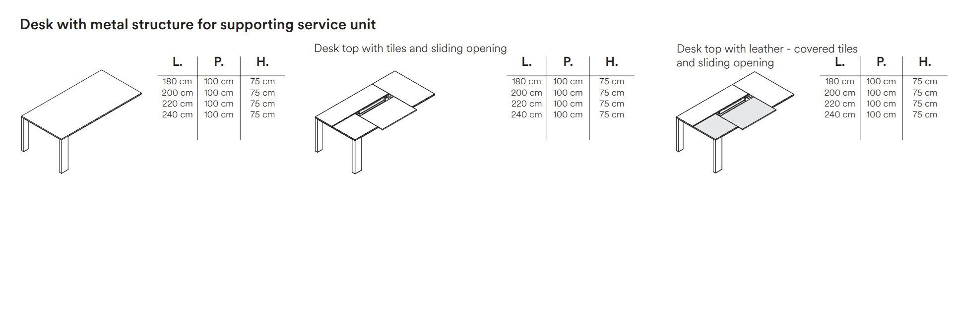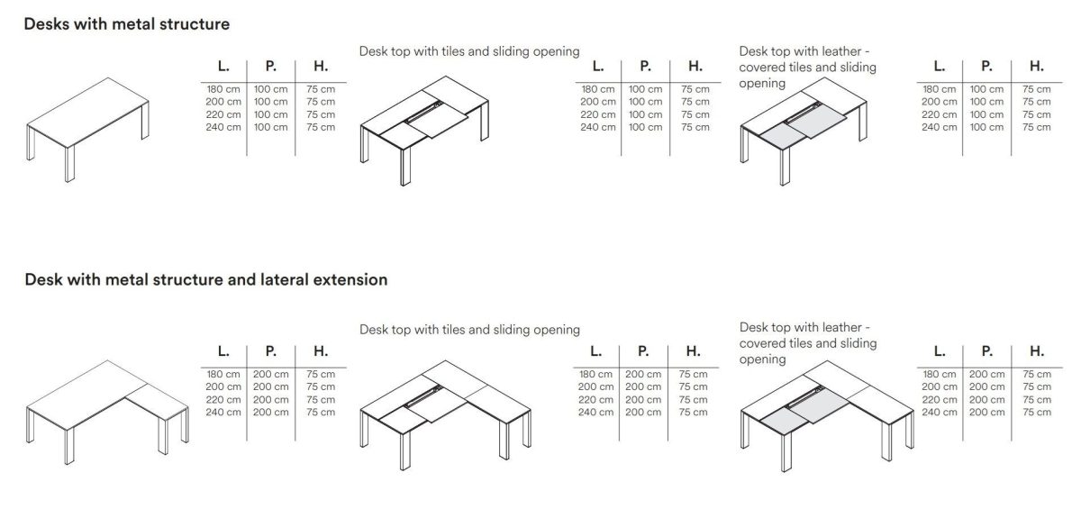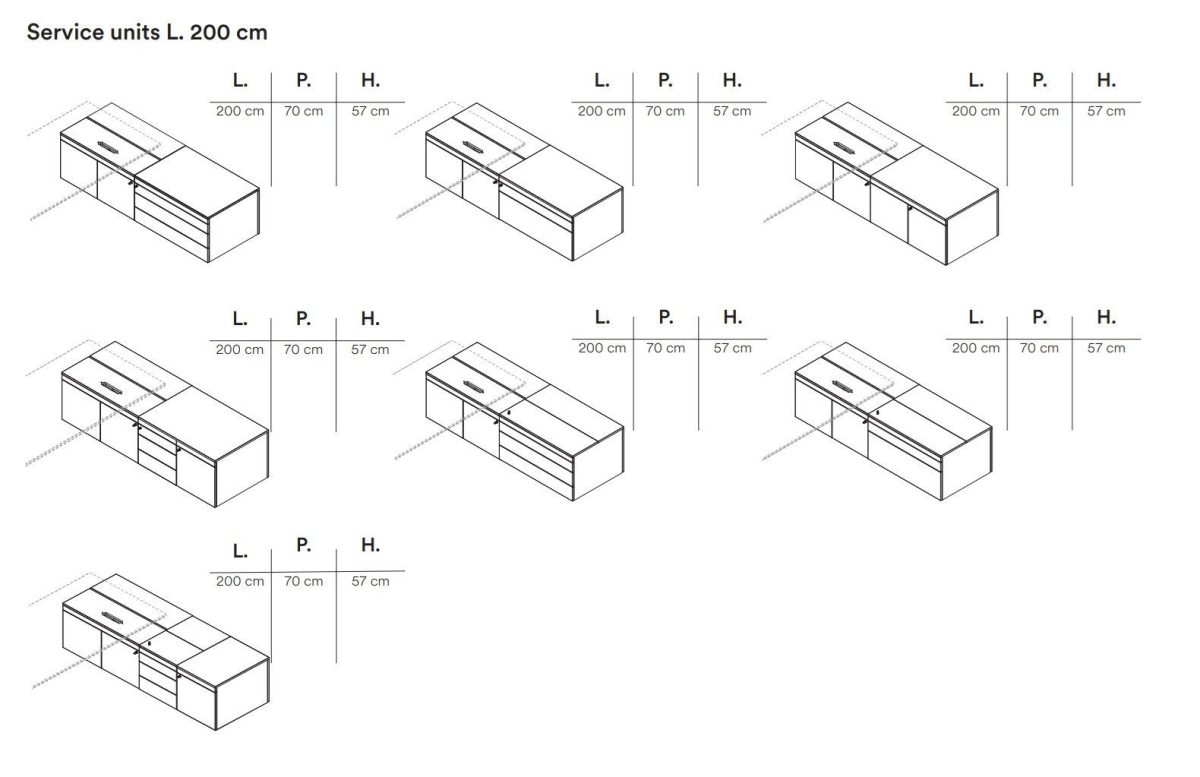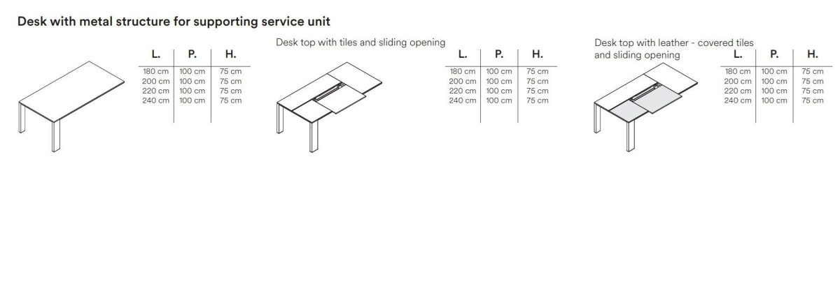 The metal-framed Ono desk consists of a brushed aluminium structure supporting a sturdy frame. This is hidden by an aluminium perimeter frame recessed from the desk profile, which is optimal to make it easier to place chairs with armrests next to the desk. A thin top, available in melamine or veneer finishes, completes the composition. The Ono desk is also available in a version with a sliding top that allows quick access to the electrification located under the desk top. In addition to the basic finishes, the tiles that compose the sliding top can also be upholstered in leather for a refined touch of elegance. The desk can also be provided with a service unit, which is available in several lengths and several configurations. The service unit is made from separate storage units that rest on a base. The design was born from the need to allow customers to choose the best composition according to their own needs. The service unit can be equipped with a discreet, lockable secretaire space for personal items.