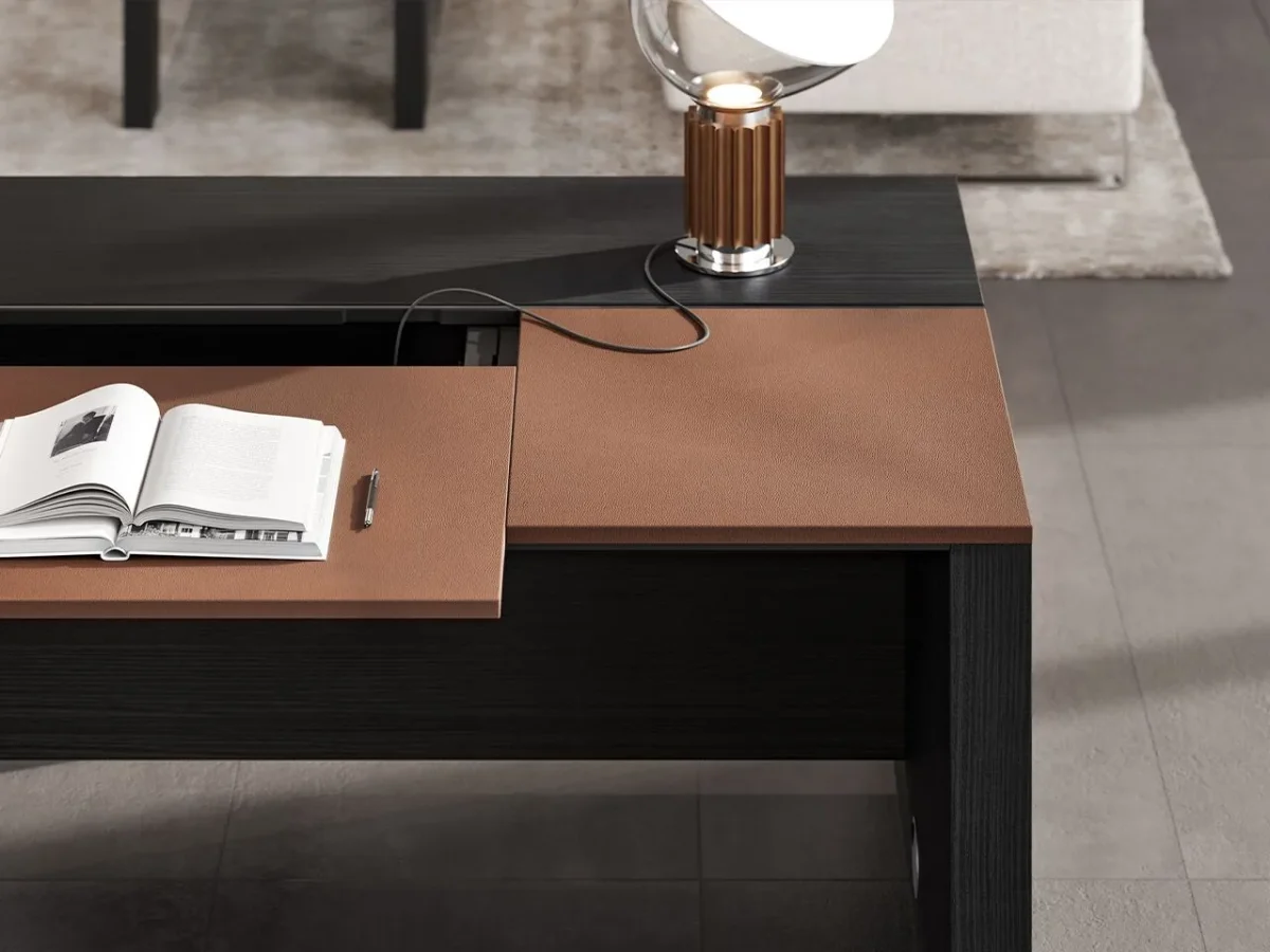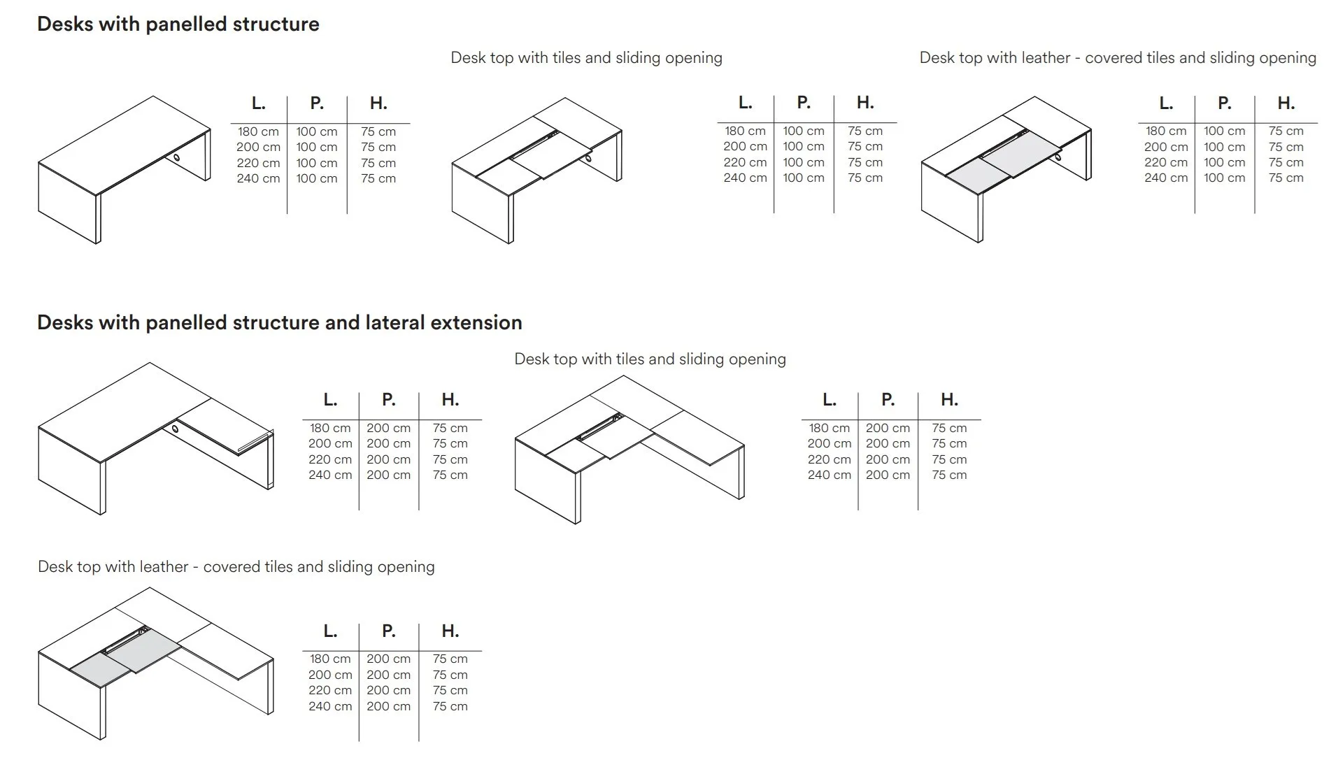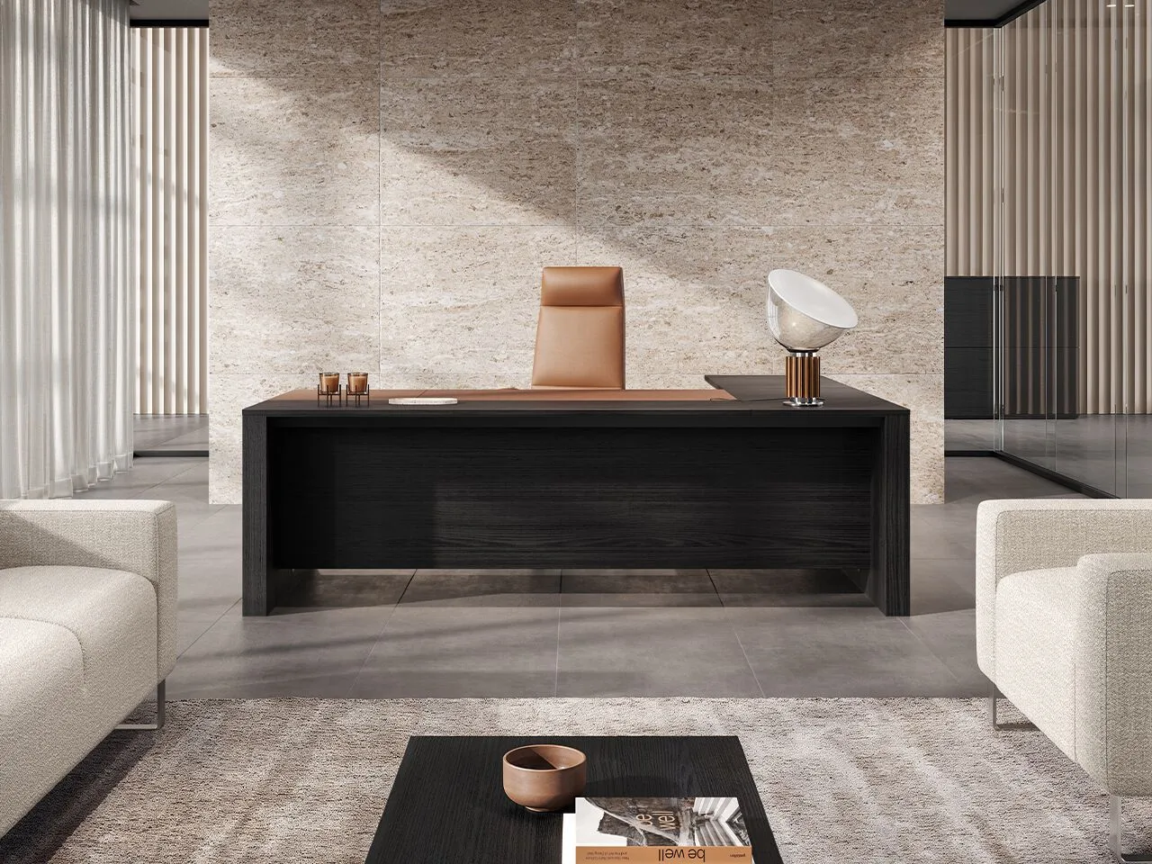 The desk with panelled structure extends and completes the Ono collection. A prestigious desk, with important dimensions, characterised by sober and contemporary lines that combine with the elegance of the materials used. The solid worktop is supported by a metal under-top, hidden by the distinctive aluminium perimeter frame. The worktop is also available with a sliding top for quick access to under-top electrification. The tops are supported by structural side panels with a thickness of 90 mm, processed using folding technology. The inner side of the side panels is equipped with two cable passages, positioned at the top and bottom, which allow vertical wiring of the desk. In this way, it is possible to have a perfectly working space without visible cables. The lower part of the sides is protected and enclosed by a metal sheet into which the adjustment feet are fixed to ensure perfect levelling of the desk to the floor. Top and sides are linked together by the modesty panel that structurally joins the entire composition, giving the desk stability. The Ono executive desk is a functional workstation that can be integrated with the service cabinet. It can be assembled according to your needs with pedestals, filing cabinets and modules with doors, and can be equipped with a small bar fridge with an ice compartment and bottle compartment. The lateral extensions help create additional work space. The extension is closed at the front by a panel that hides the legs but ensures freedom of movement. The 100 cm length is perfectly suited for a variety of activities. The desk is available in a melamine or wood finish, and in the case of sliding tops, the movable tiles can be upholstered in leather.