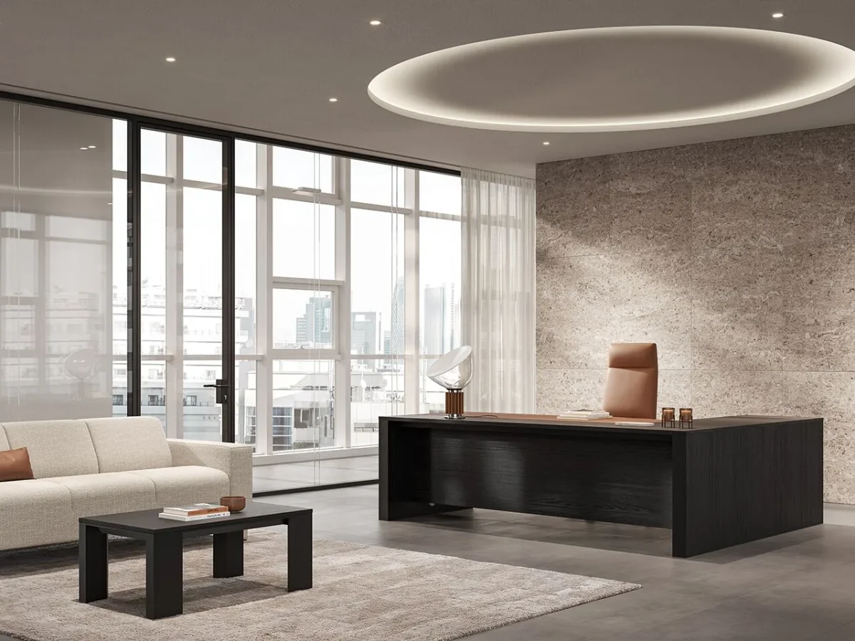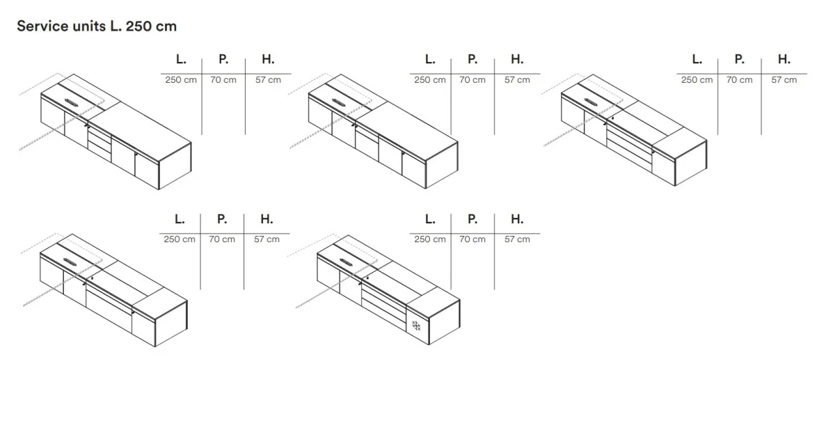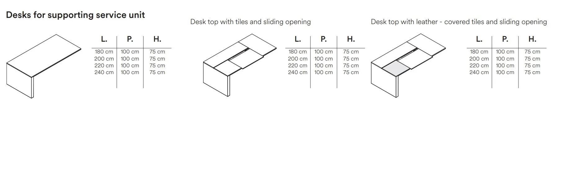 The desk with panelled structure extends and completes the Ono collection. A prestigious desk, with important dimensions, characterised by sober and contemporary lines that combine with the elegance of the materials used. The solid worktop is supported by a metal under-top, hidden by the distinctive aluminium perimeter frame. The worktop is also available with a sliding top for quick access to under-top electrification. The tops are supported by structural side panels with a thickness of 90 mm, processed using folding technology. The inner side of the side panels is equipped with two cable passages, positioned at the top and bottom, which allow vertical wiring of the desk. In this way, it is possible to have a perfectly working space without visible cables. The lower part of the sides is protected and enclosed by a metal sheet into which the adjustment feet are fixed to ensure perfect levelling of the desk to the floor. Top and sides are linked together by the modesty panel that structurally joins the entire composition, giving the desk stability. The Ono executive desk is a functional workstation that can be integrated with the service cabinet. It can be assembled according to your needs with pedestals, filing cabinets and modules with doors, and can be equipped with a small bar fridge with an ice compartment and bottle compartment. The lateral extensions help create additional work space. The extension is closed at the front by a panel that hides the legs but ensures freedom of movement. The 100 cm length is perfectly suited for a variety of activities. The desk is available in a melamine or wood finish, and in the case of sliding tops, the movable tiles can be upholstered in leather.
