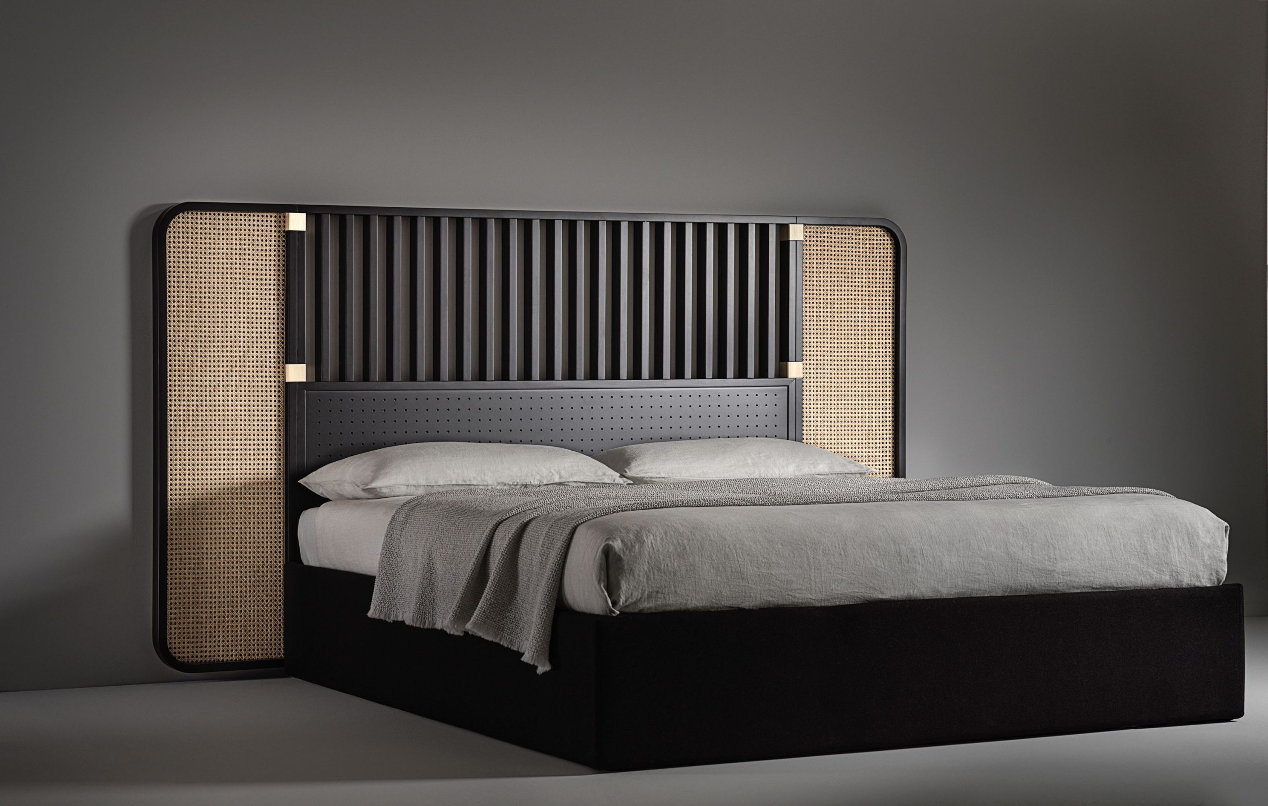 Bringing their highly architectural approach to the world of furniture for the first time, Storagemilano – the architecture and design studio founded by Barbara Ghidoni, Marco Donati and Michele Pasini – has created the stunning OTTOW headboard, featuring a bent beech-wood structure with square cross-sections, in two finishes: lacquered black or natural stained. An intriguing contemporary take on a classic decorative style, OTTOW creates a wood-panelling effect on the wall through a combination of different materials. The side inserts in woven cane frame the central section in perforated wood – also available in the upholstered version – while the black lacquered version comes with brass details and the natural stained version gets copper. The name is an evocative one: the choice of square cross-sections and the panel of perforated wood reveal that OTTOW is a tribute to Otto Wagner and his iconic 1906 Postsparkasse collection, which remains in the GTV catalogue to this day.