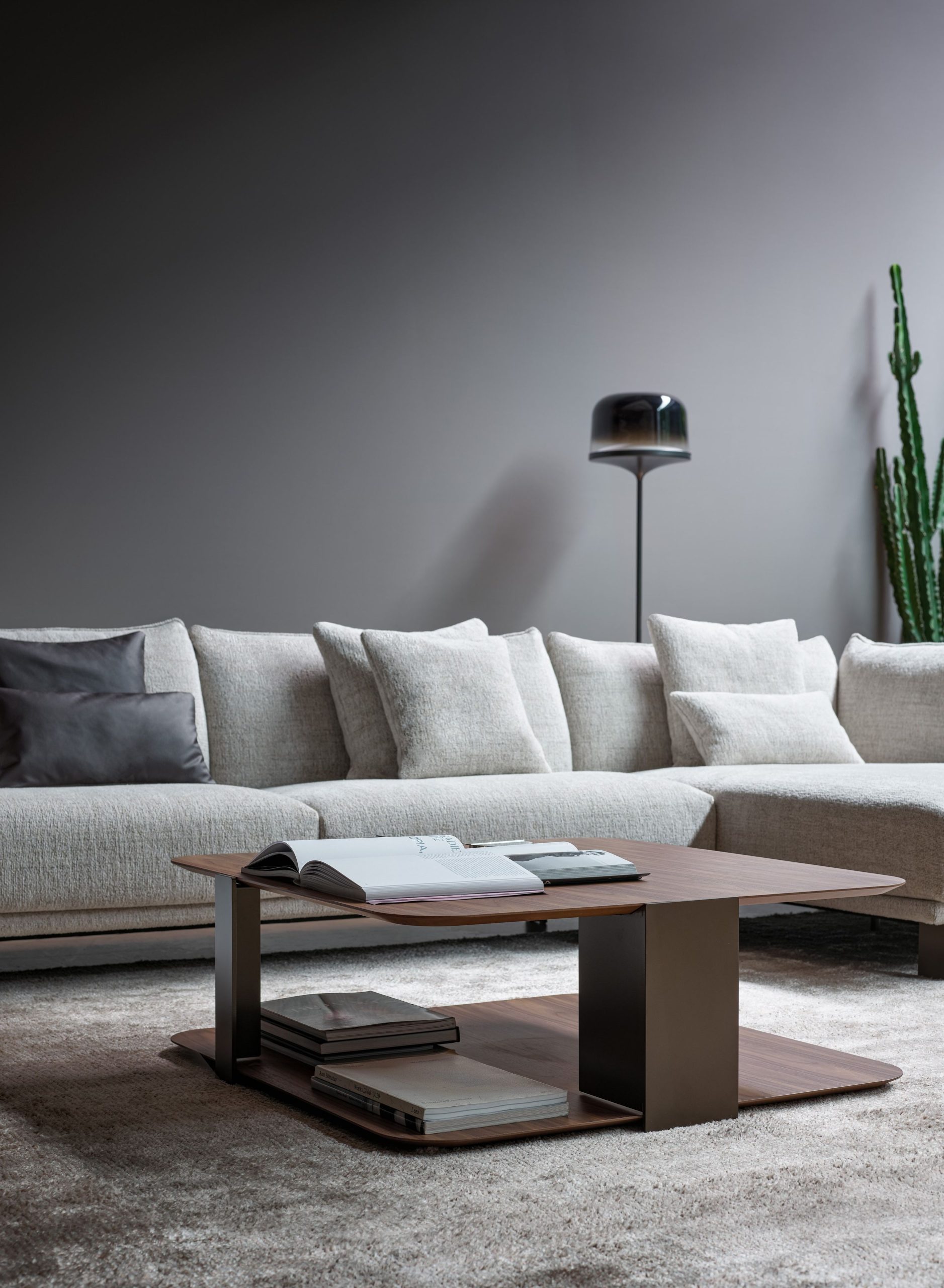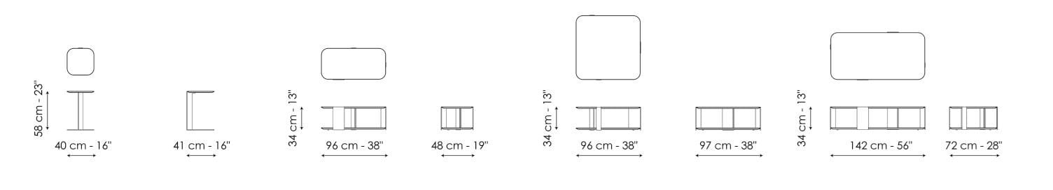 They are distinguished by the clear-cut shapes of the metal tops and profiles and softened by the rounded edges. Arranged individually or in combination with other elements, this offers ample possibilities for insertion in the most disparate domestic and hospitality spaces.