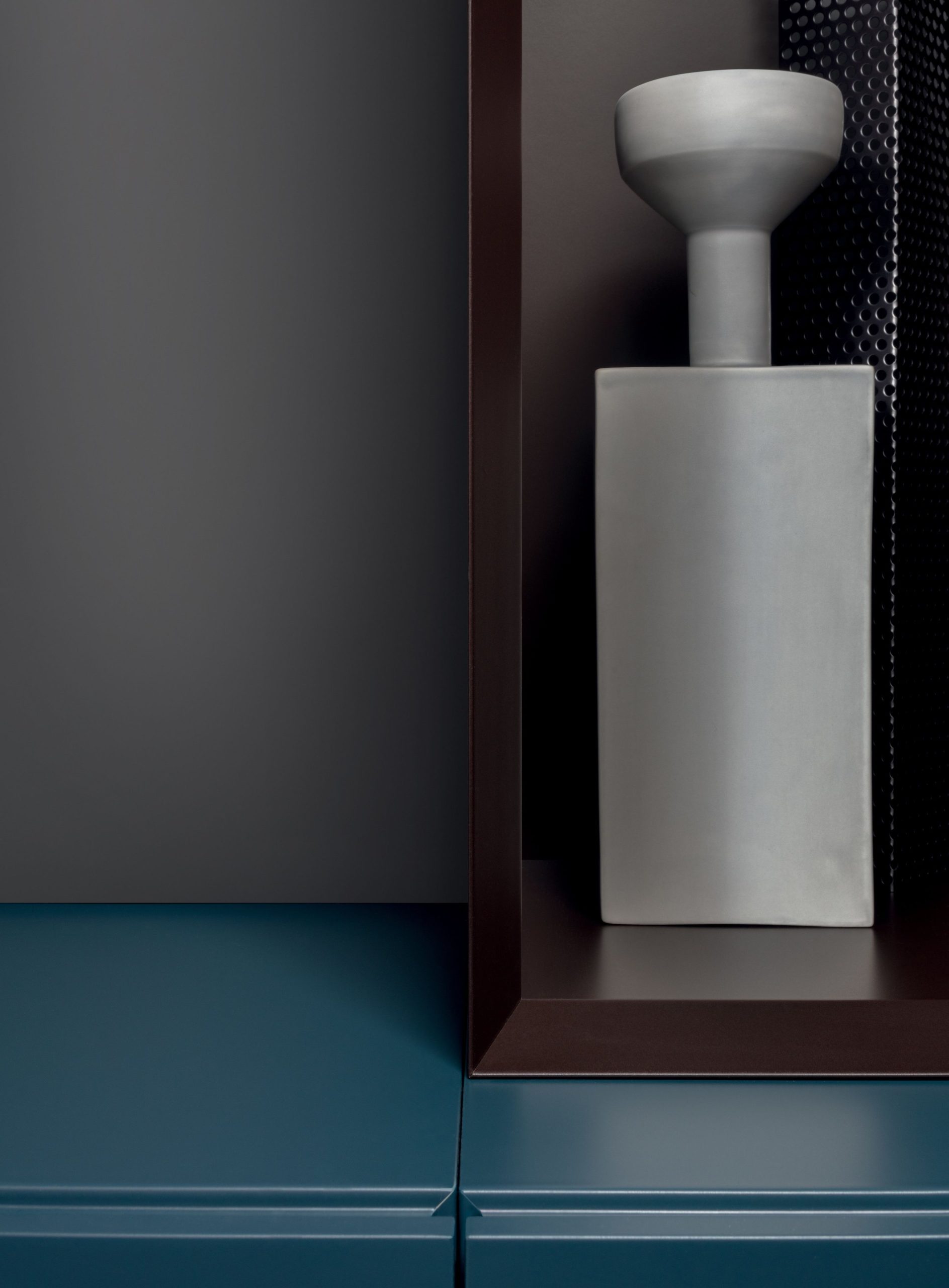 Geometric design meets sophisticated detail. Elegance is the key to rediscovering the beauty of everyday living. The modular People system is the perfect solution for those who love to see their ideas take shape, customising their home interiors with freedom and refined beauty. The mitre-folding carcass and absence of handles create a flowing, subtle design, with contrasting luxurious accent details, like the spacer elements, backlit glass shelves, new hard leather fronts and back panels in materico marble.