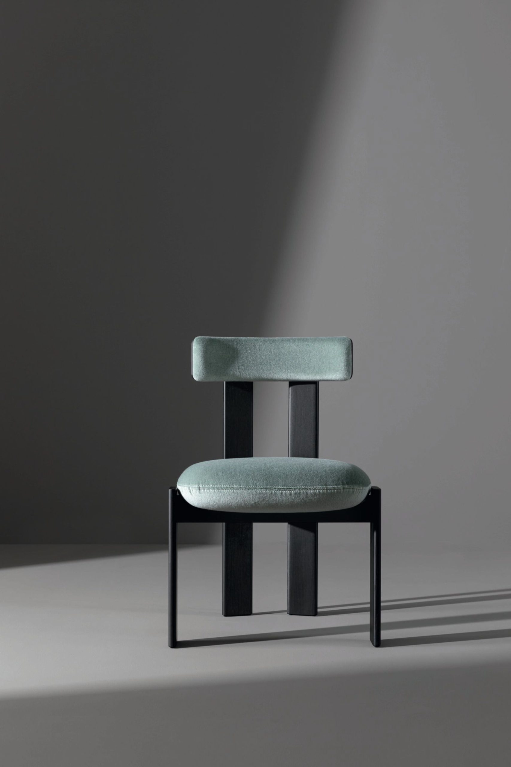 Designed by Alain Gilles, the Pi chair has an iconic style and a graphic and rigorous frame which combines minimal style and maximum comfort. The soft and rounded cushion of the seat almost seems to merge with the solid wood frame, while the delicately curved backrest evokes the shape of the mathematical sign “Pi”, harmoniously combining all the elements. The rear legs, with their rounded ends, create an almost graphic connection with the upper line of the backrest. The Pi chair fully reveals its character when it is positioned around a table, becoming the fulcrum of the space with a distinctive and vigorous presence.