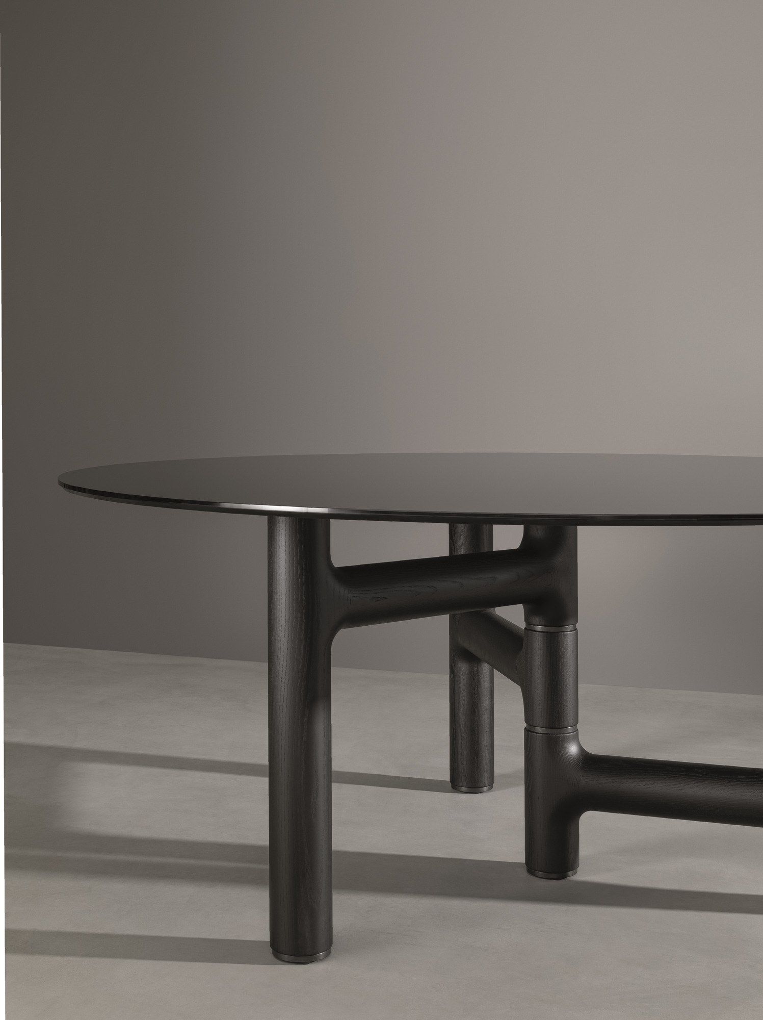 The legs are made of coal oak or walnut solid wood with metal inserts, while the top is available in marble, wood, glass and ceramic, in the two round and round-edged versions.