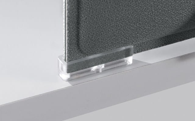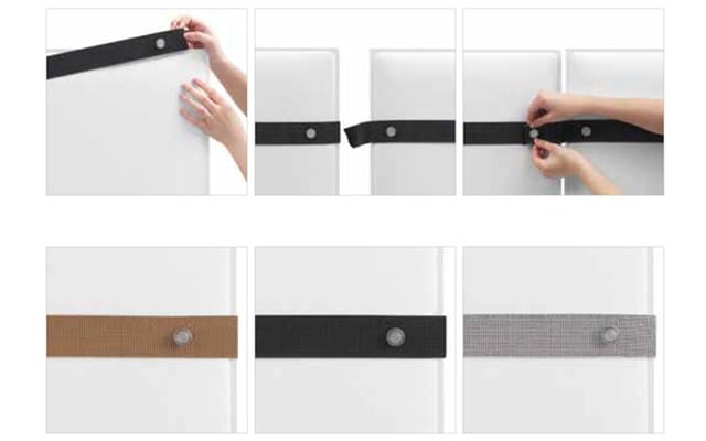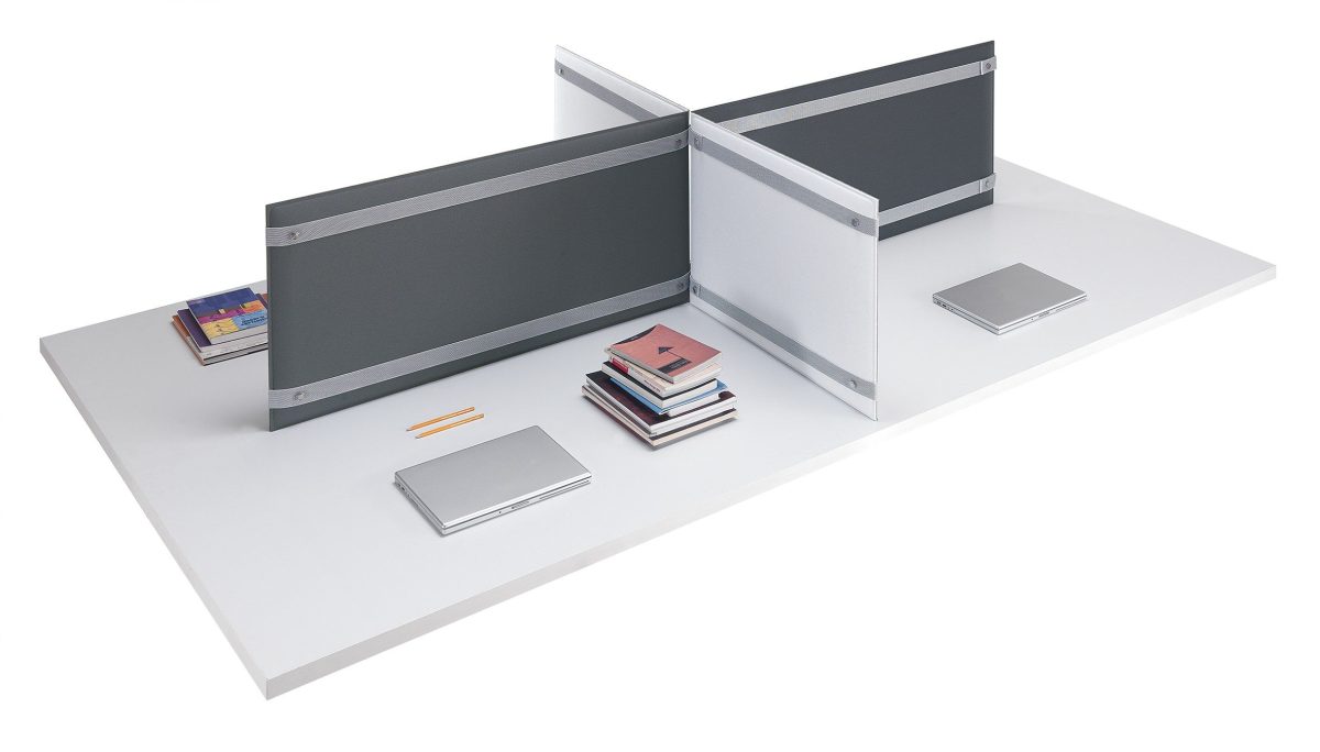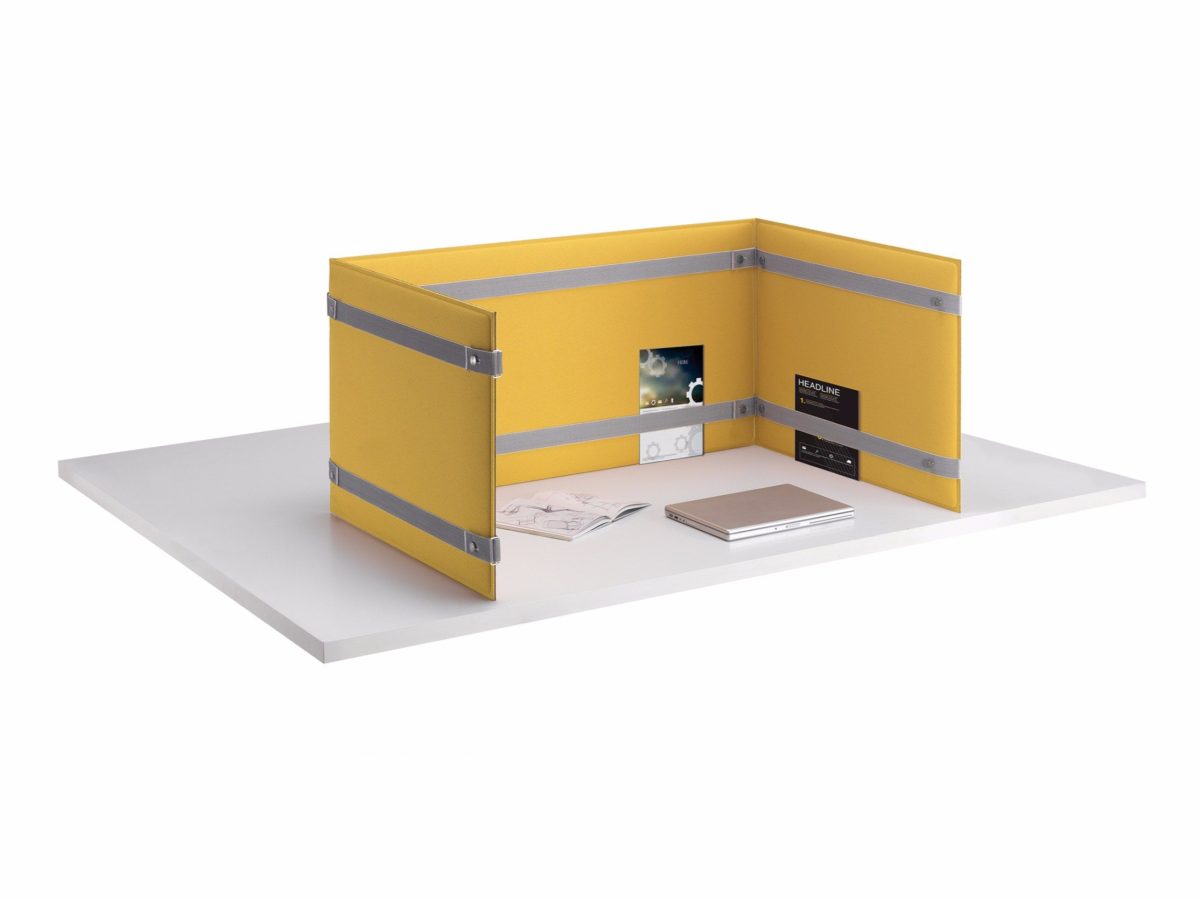 Pli sound-absorbing panels can be also used as desk top partitions, thereby ensuring acoustic comfort, privacy and ultimate freedom of configuration thanks to the elastic straps that hold the panels together to create linear, T, L or X formations.