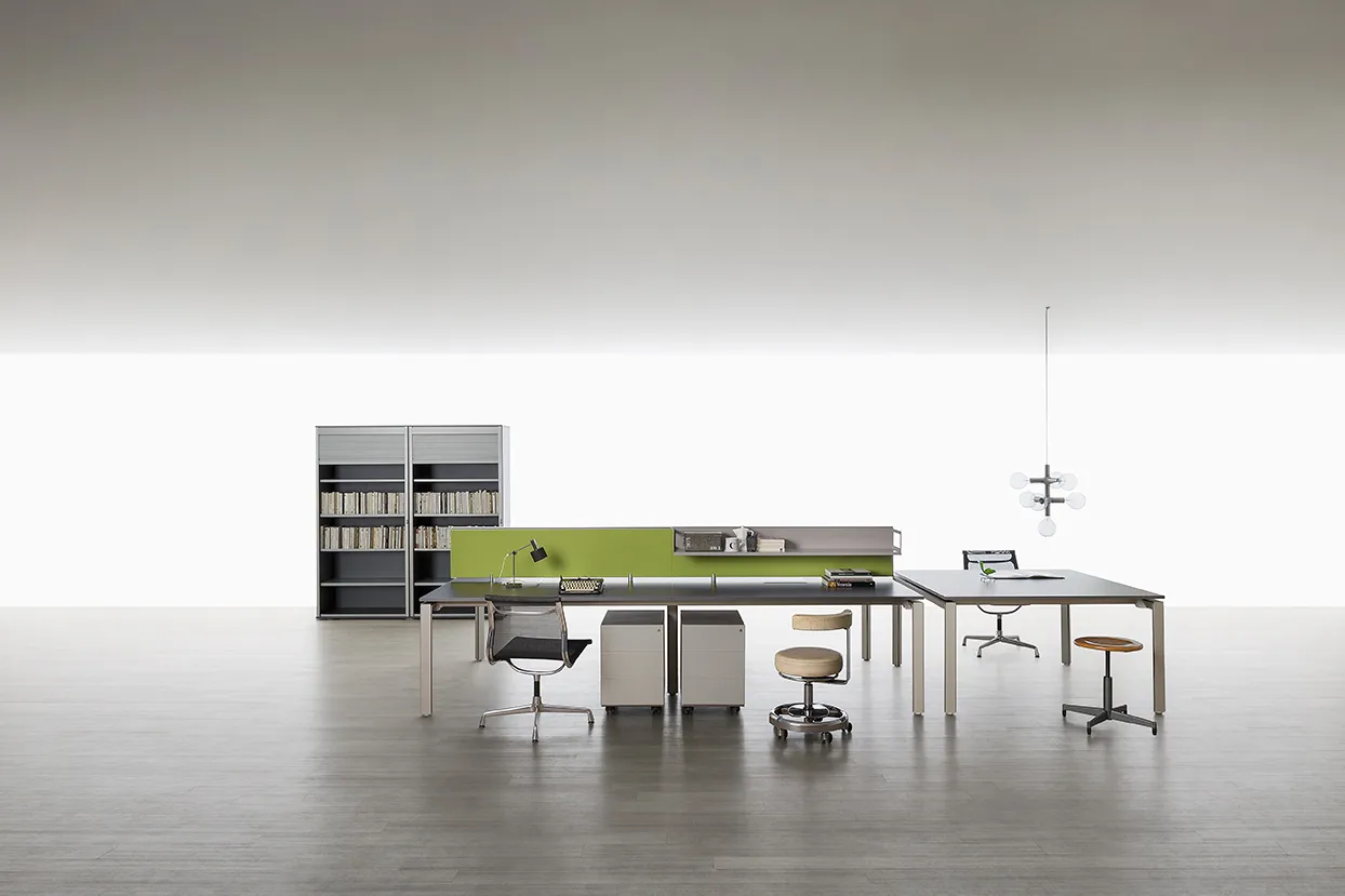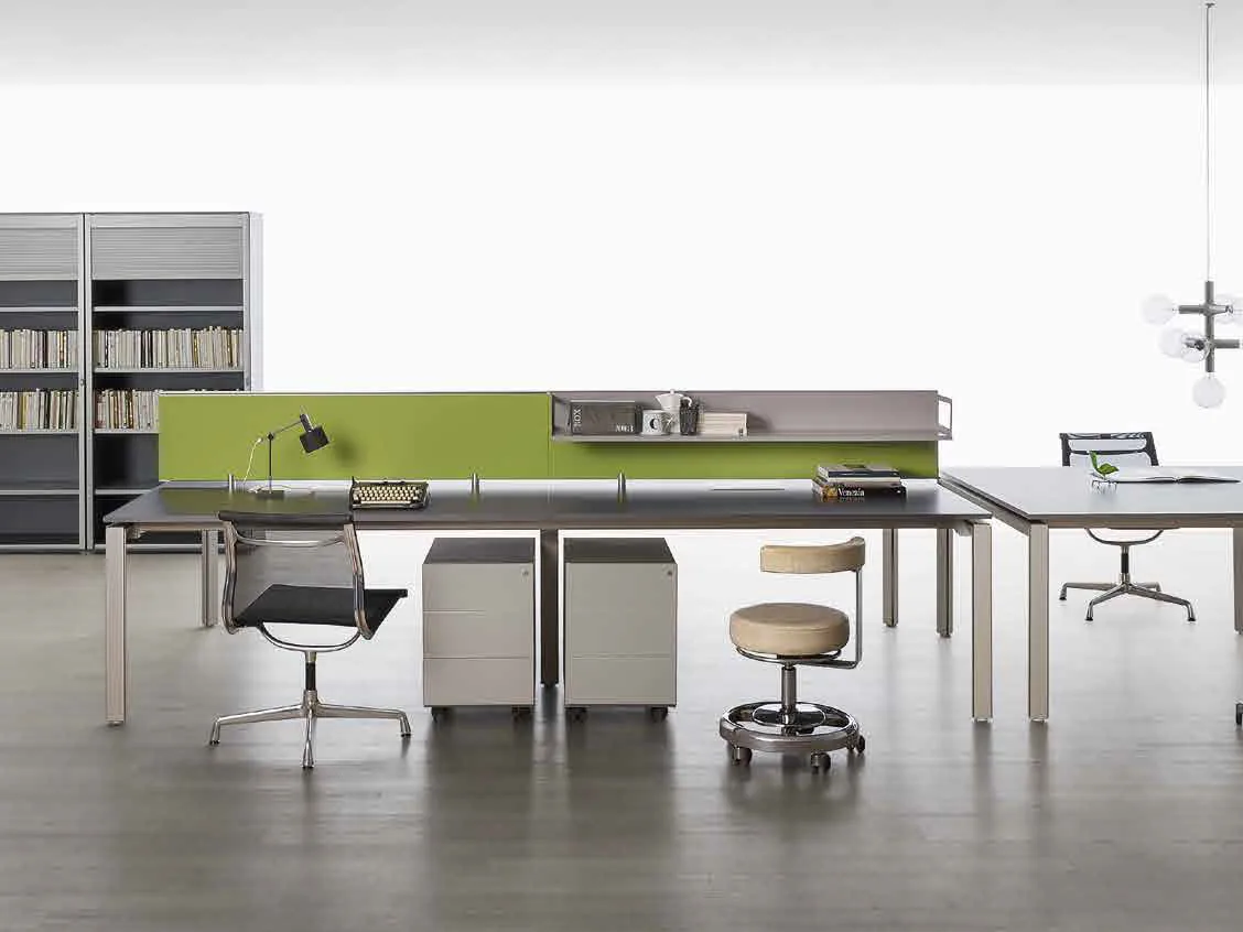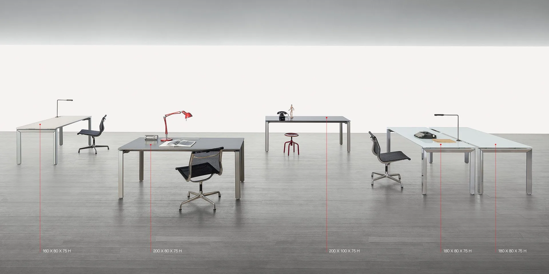 Trestle legs, in aluminium extruded profiles with triangular cross-section, a distinguishing trait of the entire collection. Materials, geometries and shapes communicate great solidity and make this product ideal for the working environments or for offices where functionality and style are essential.
